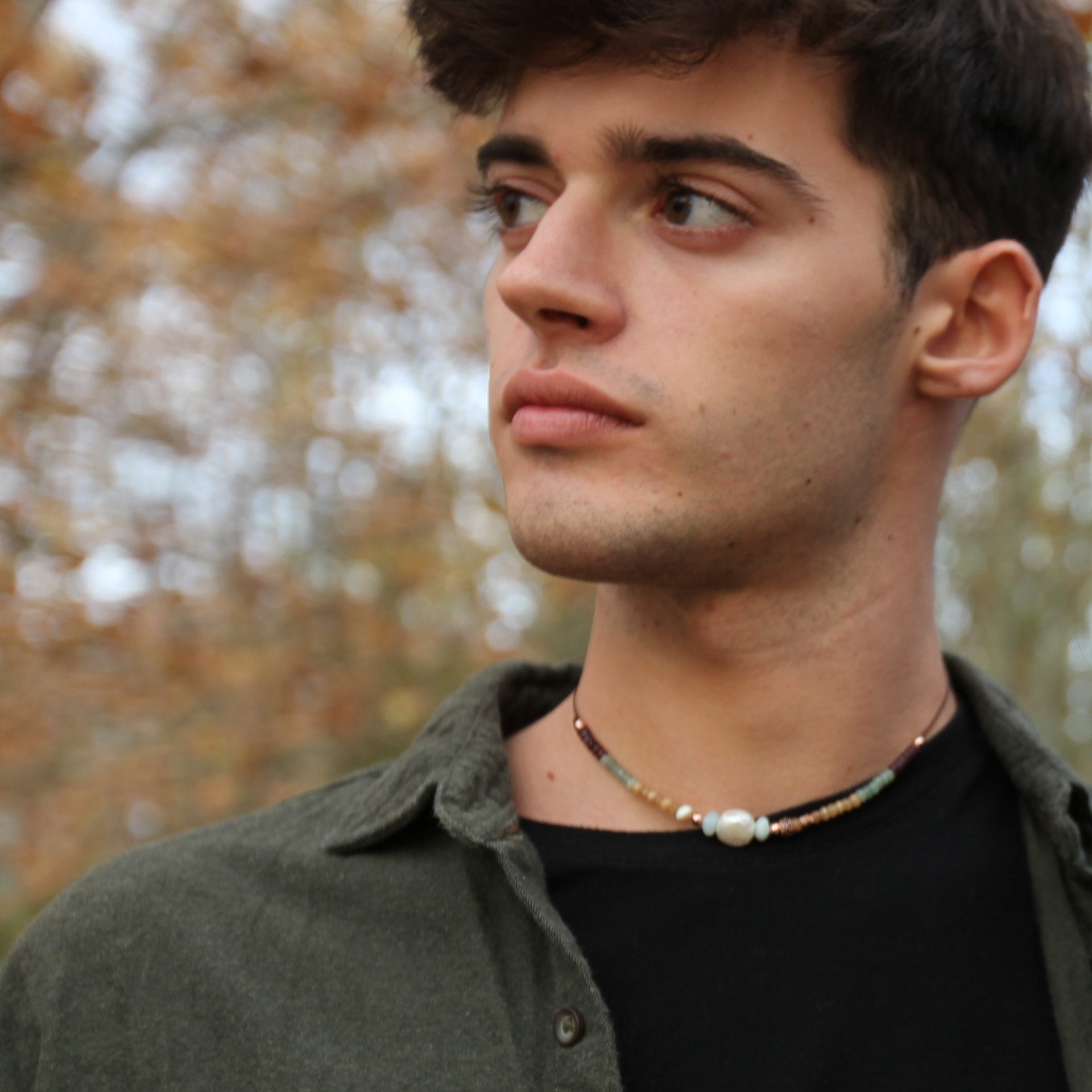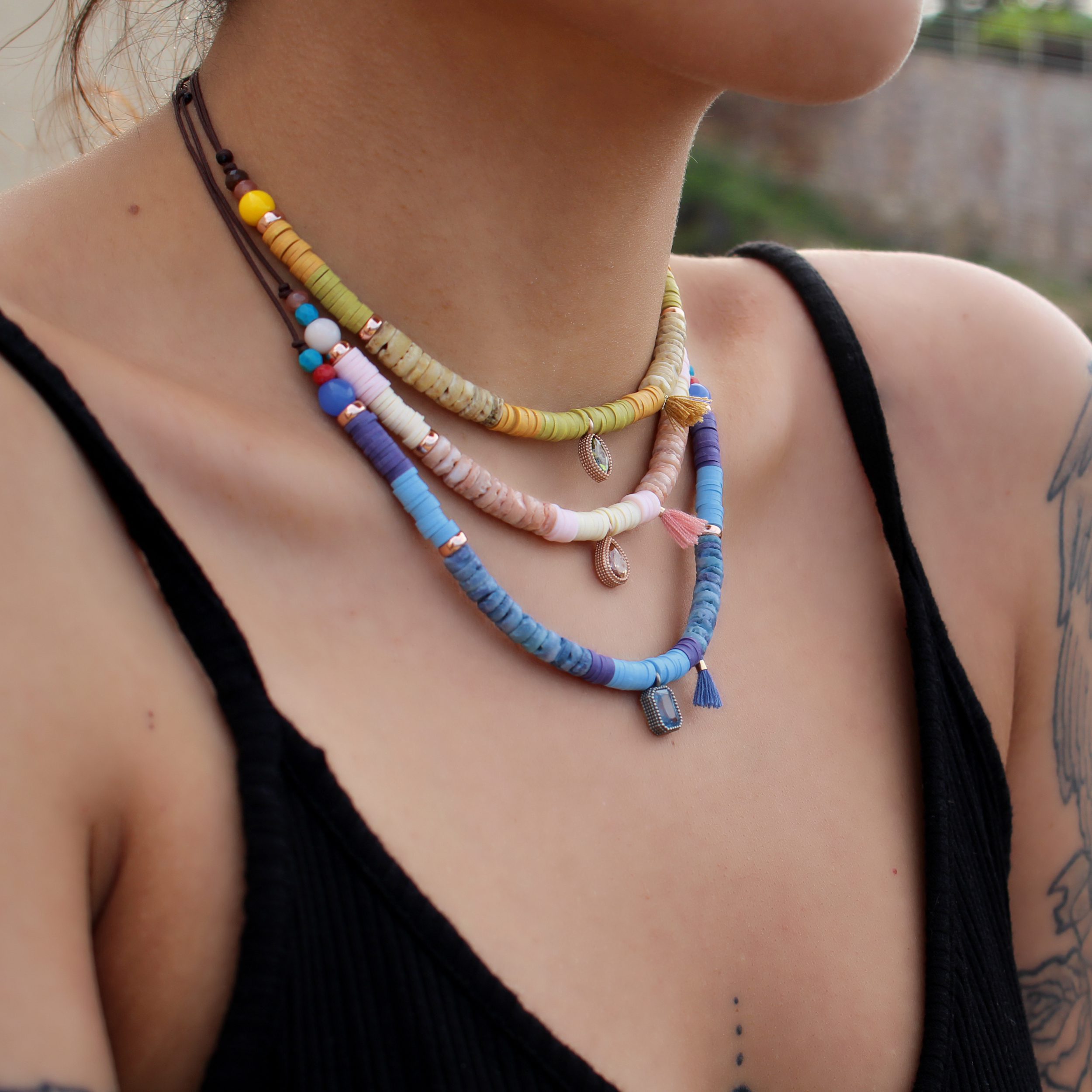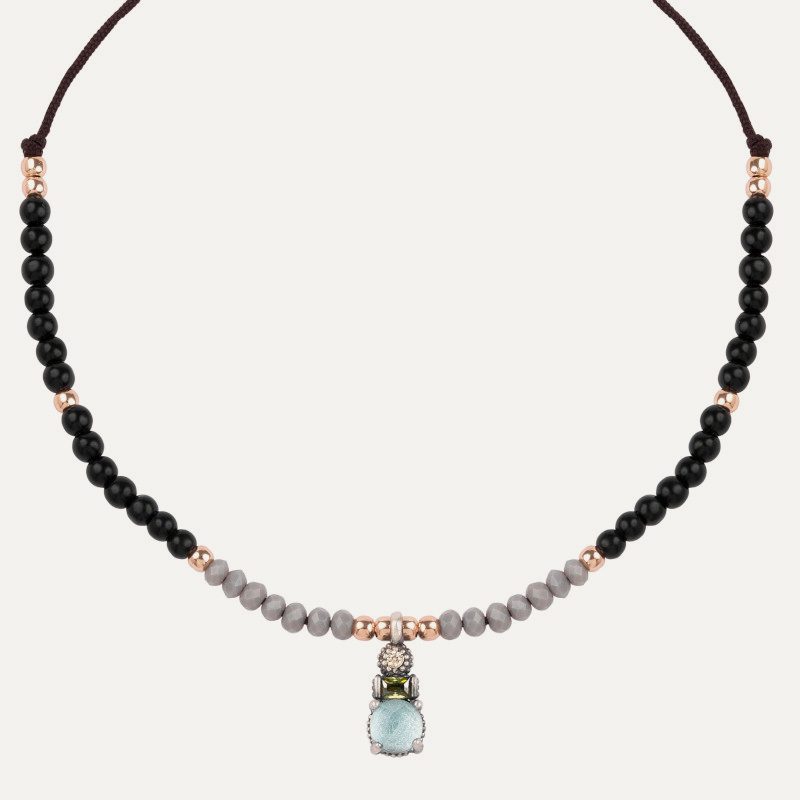 Colgante de plata de ley, cuarzo en símil ópalo azul, ágatas, hematites, circonitas y nylon.