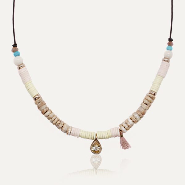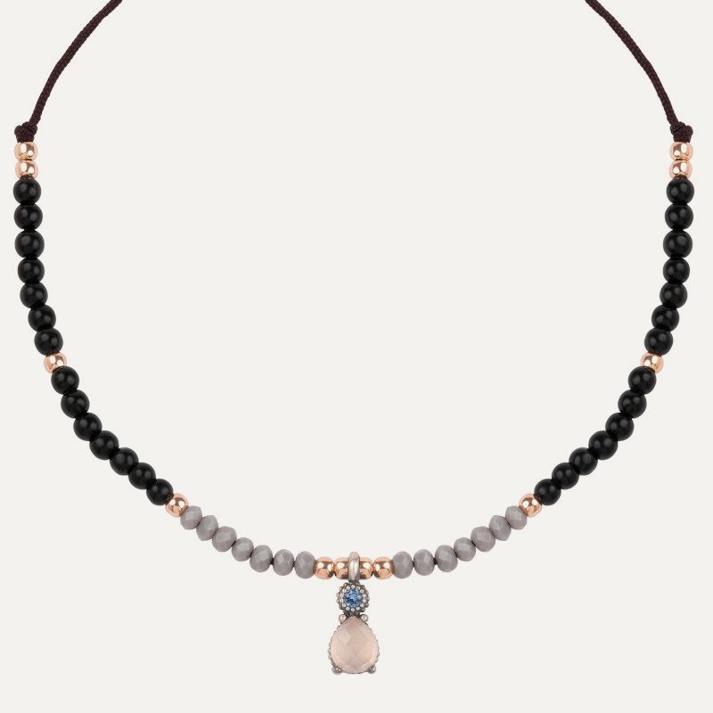 Colgante de plata de ley, cuarzo rosa, ágatas, hematites, circonitas y nylon.