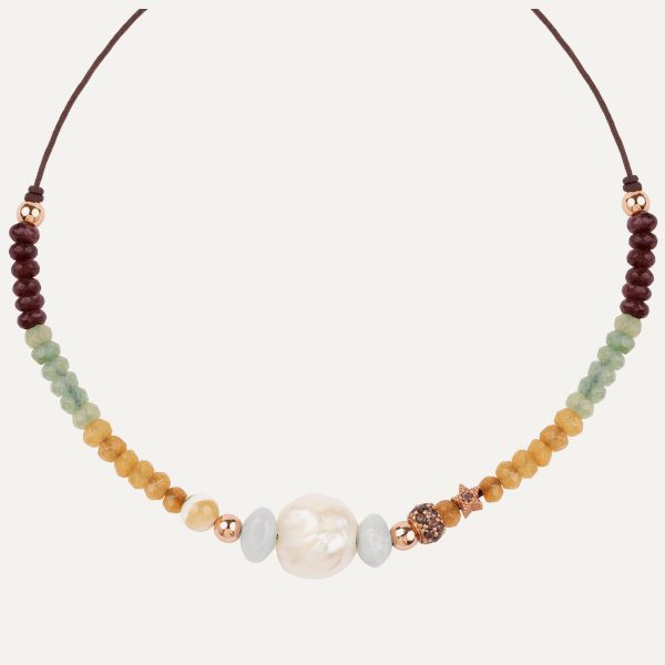 Colgante de plata de ley con baño de oro rosa de 24 kt, perla barroca, ágatas y circonitas.