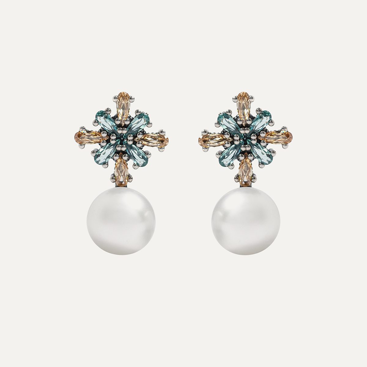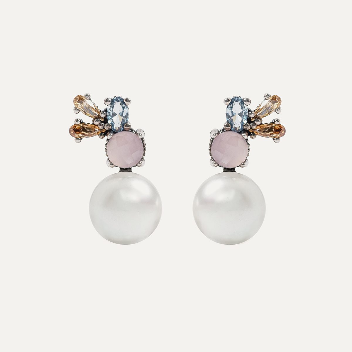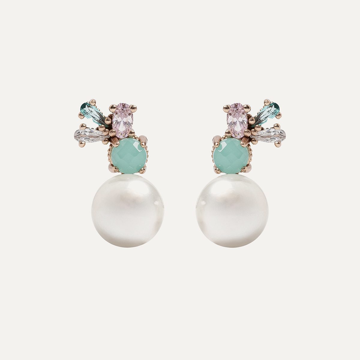 Pendientes de plata de ley 925 con circonitas y cabujón. Disponible en varios colores.