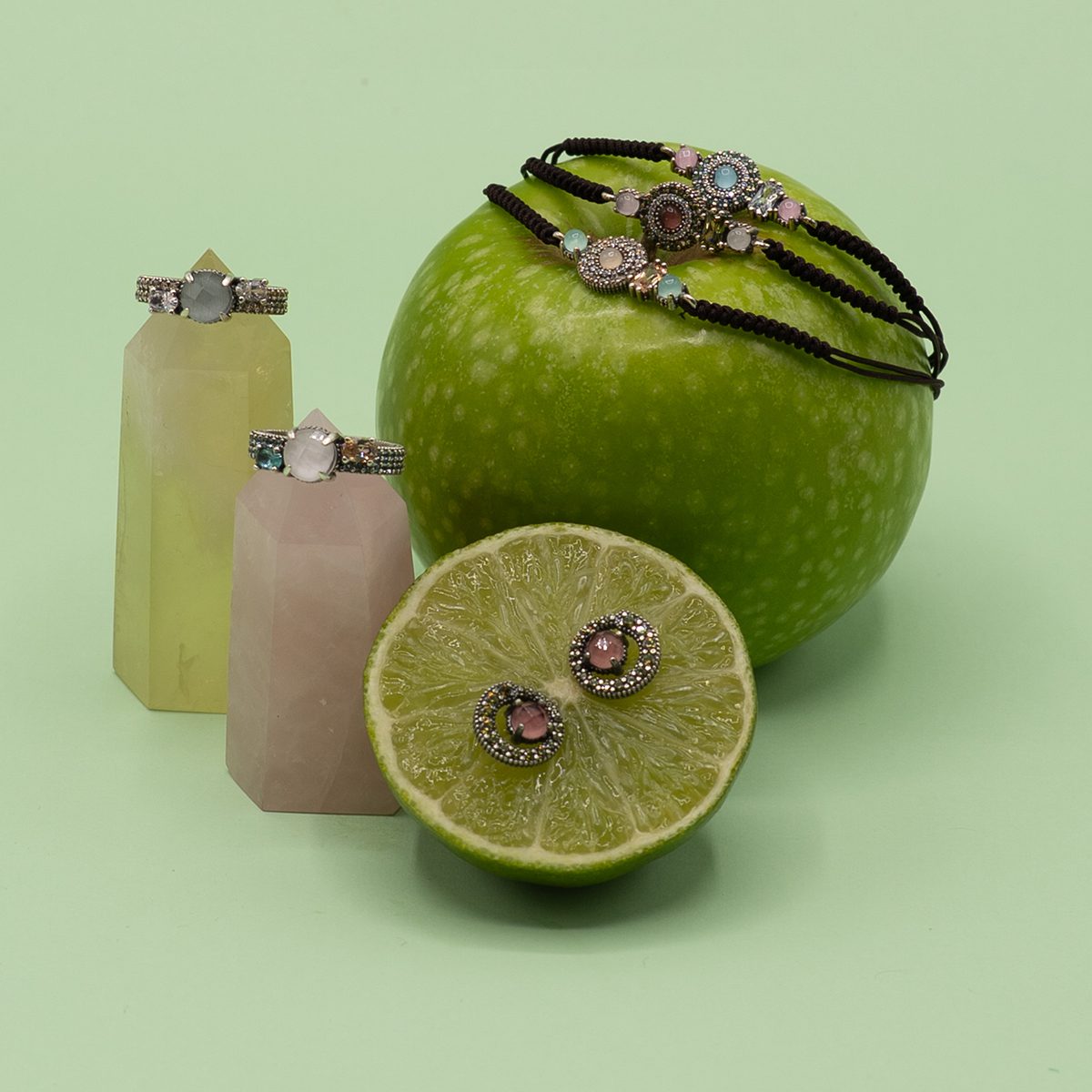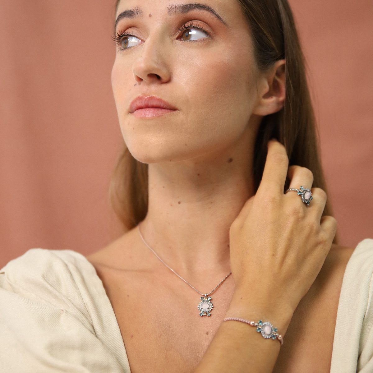 Conjunto de anillo, colgante y pulsera de plata de ley 925 y circonitas, en 2 combinaciones a elegir: cuarzo rosa o turmalina.