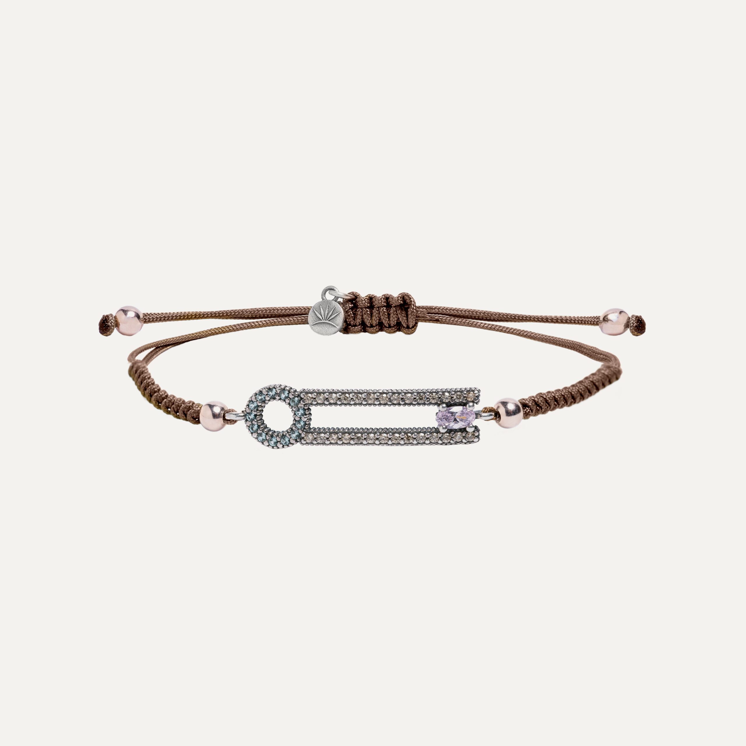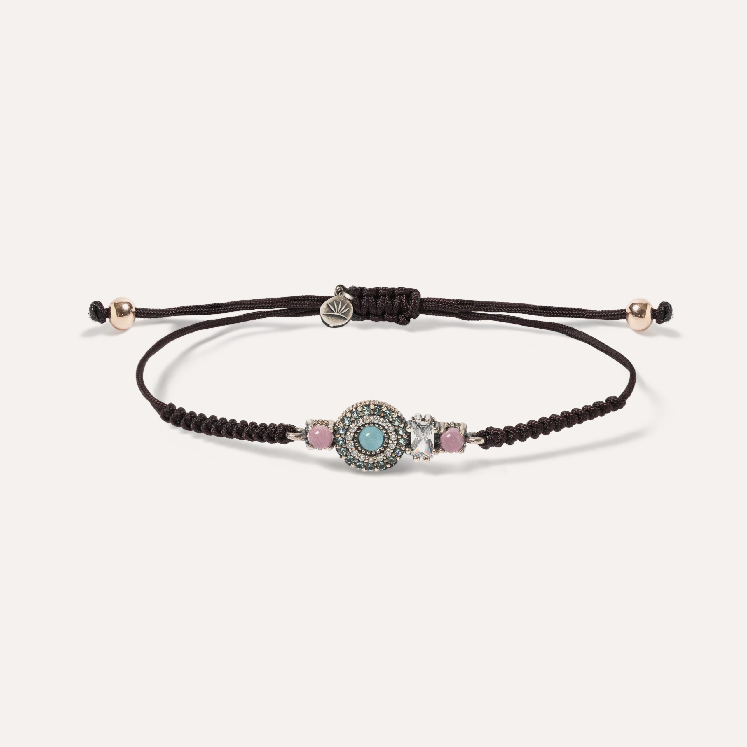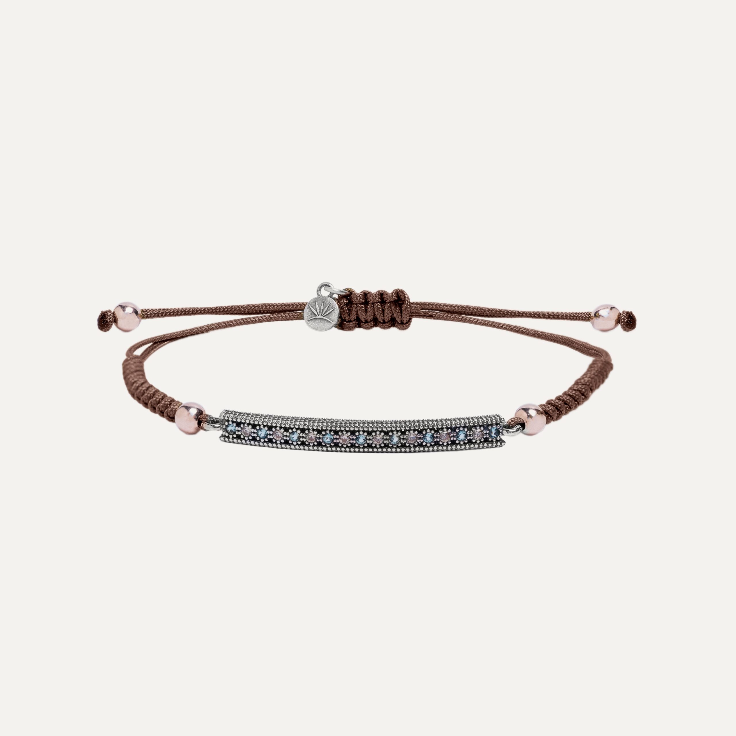 Pulsera de macramé marrón con barra en plata con circonitas combinadas en mint y cava.