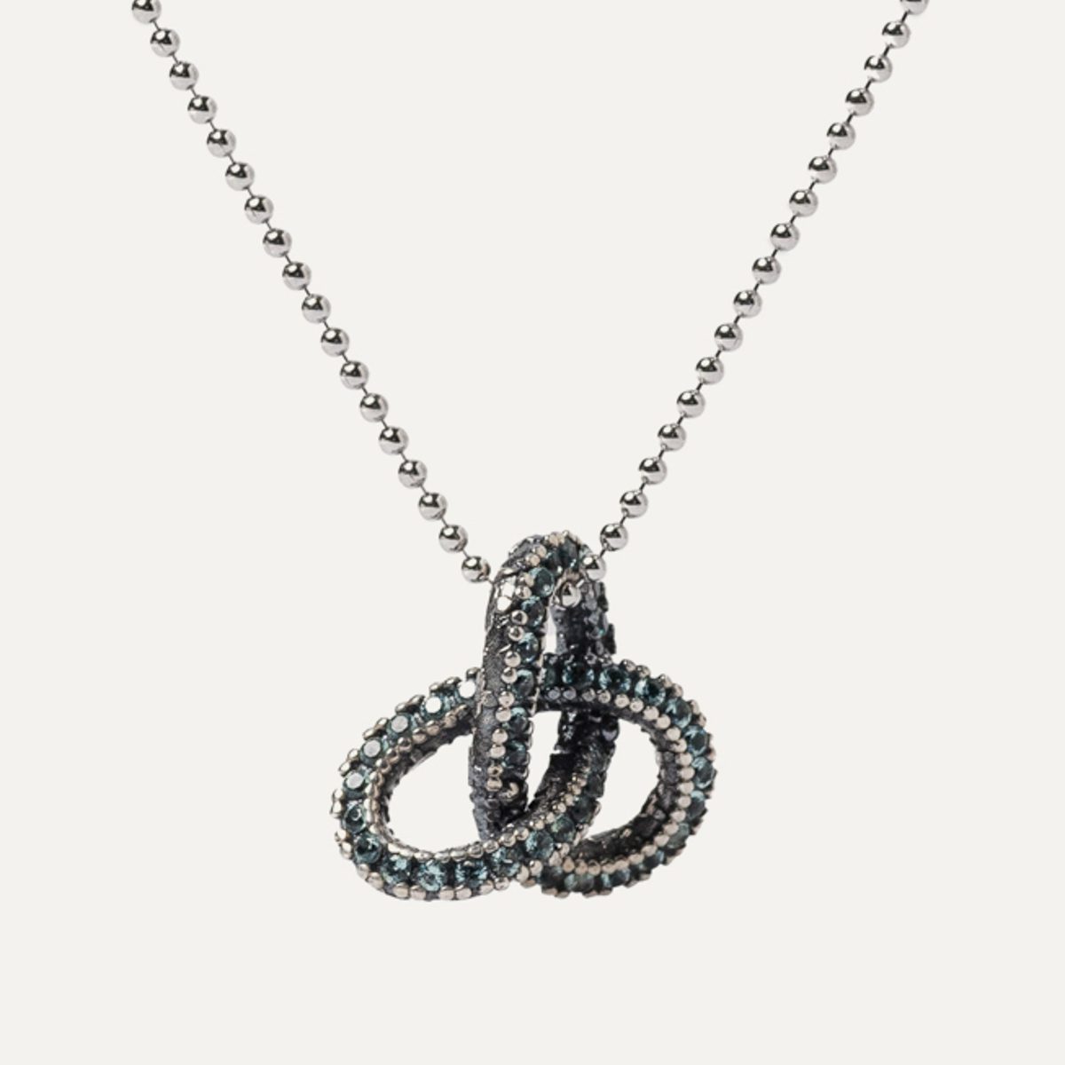Este colgante está bañado en oro rosa de 24 kt está embellecido con circonitas verde mint y cava, mientras que la cadena en plata envejecida añade...