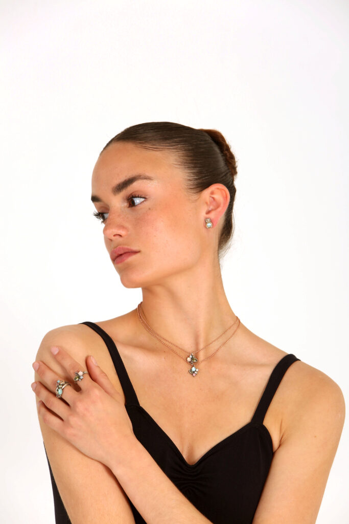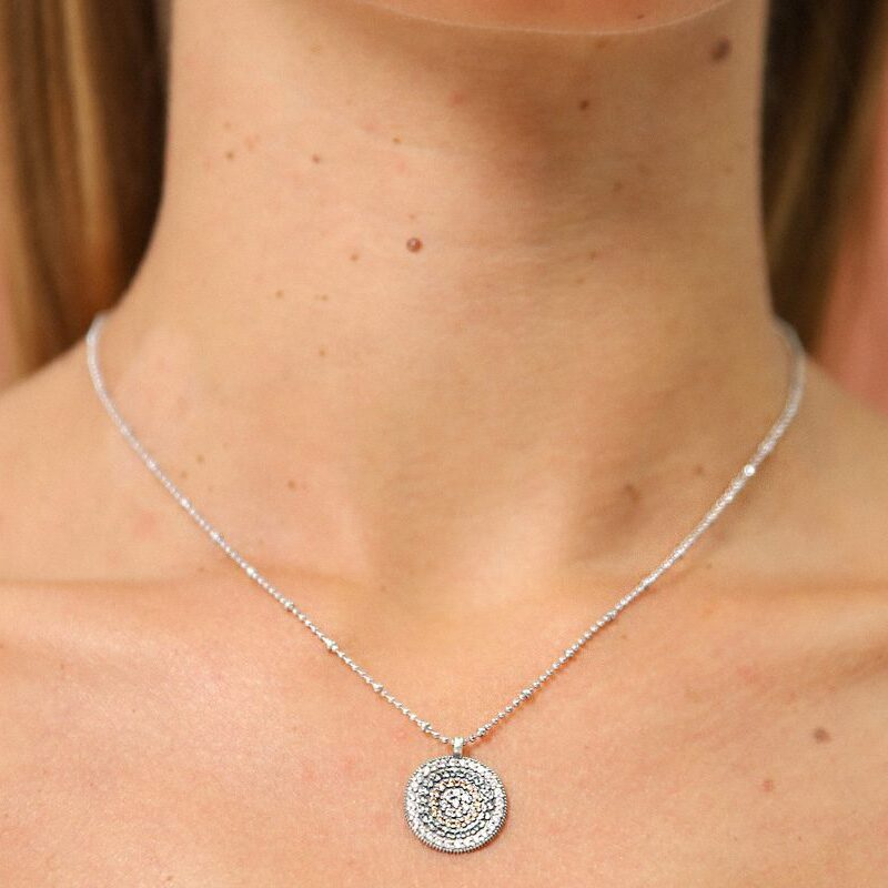 El Colgante Daria Perl es ideal para escotes redondos. Su diseño romántico hecho en plata de ley con acabado envejecido y circonitas blancas clavadas a mano, equilibra y destaca este tipo de escote.
