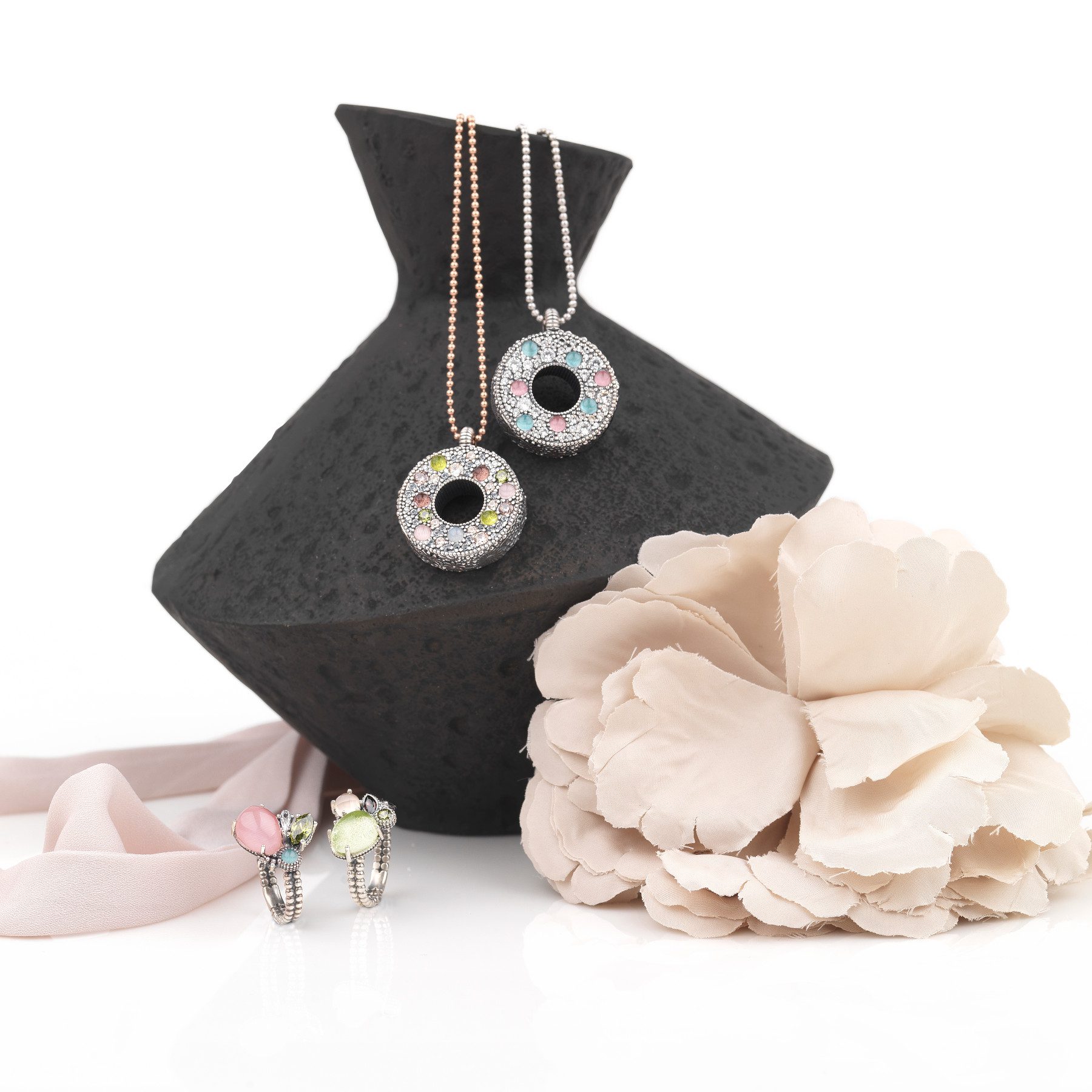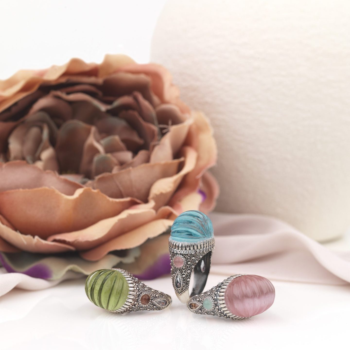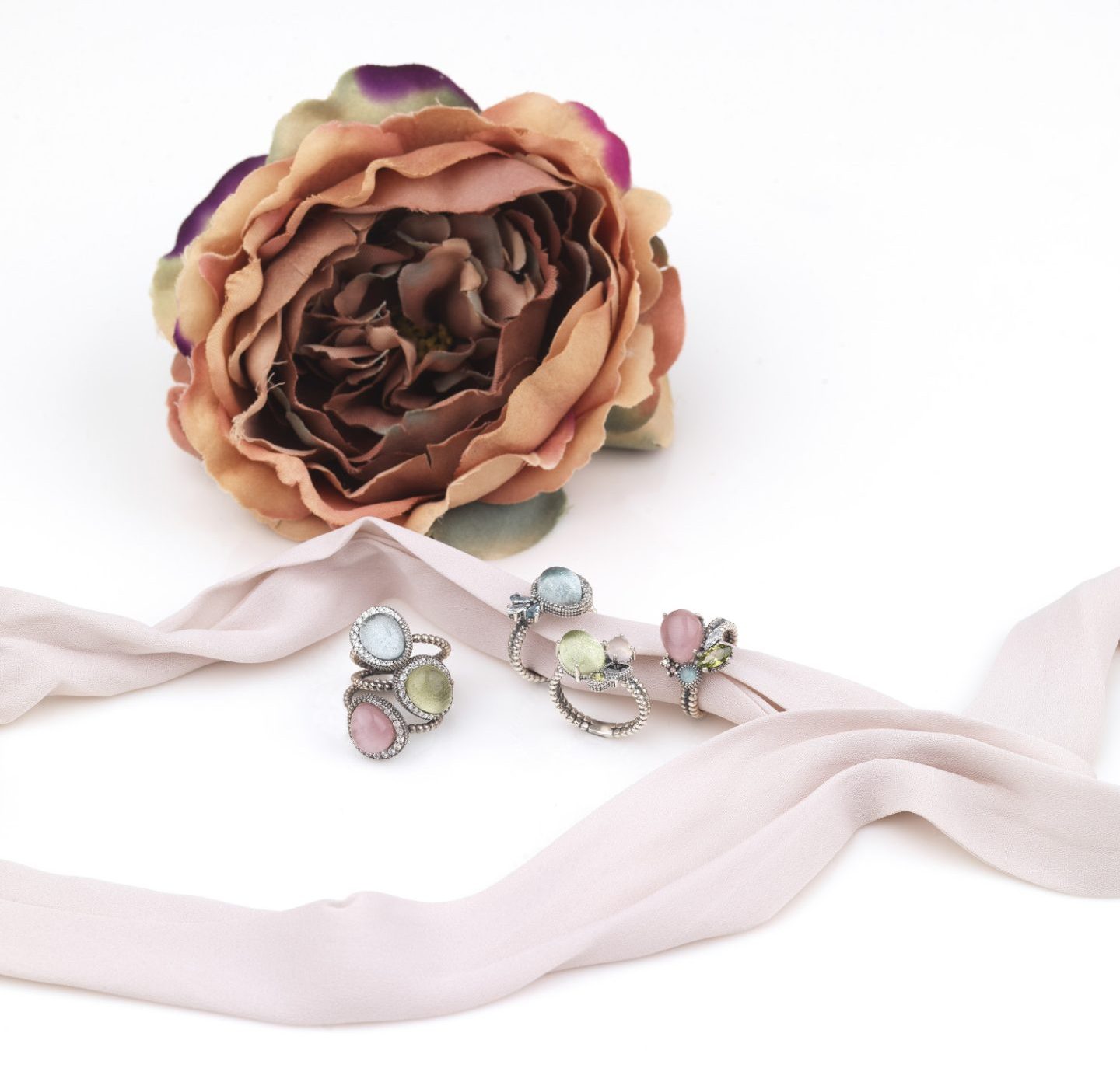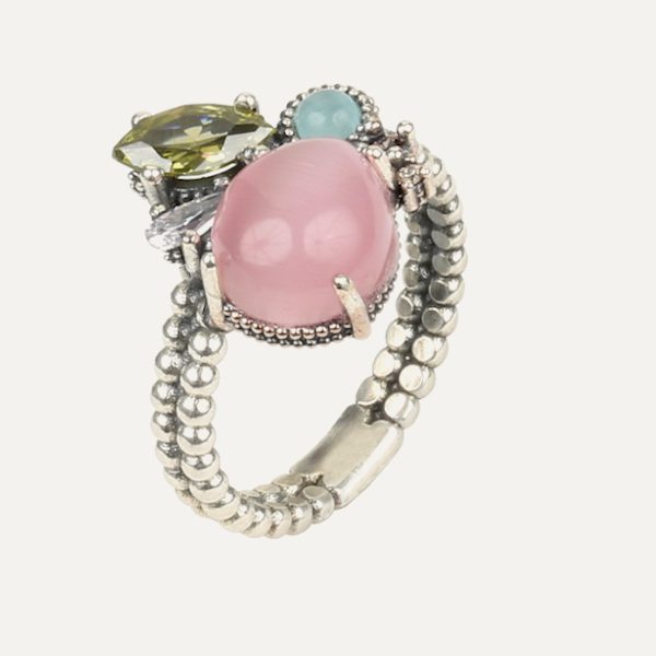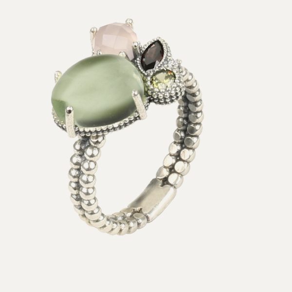 Anillo de plata de ley 925, cuarzo verde apple, cuarzo rosa y circonitas.