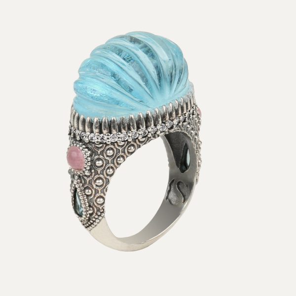 Anillo de plata de ley 925 con acabado envejecido, aguamarina y circonitas color cava y talla brillante clavadas a mano.