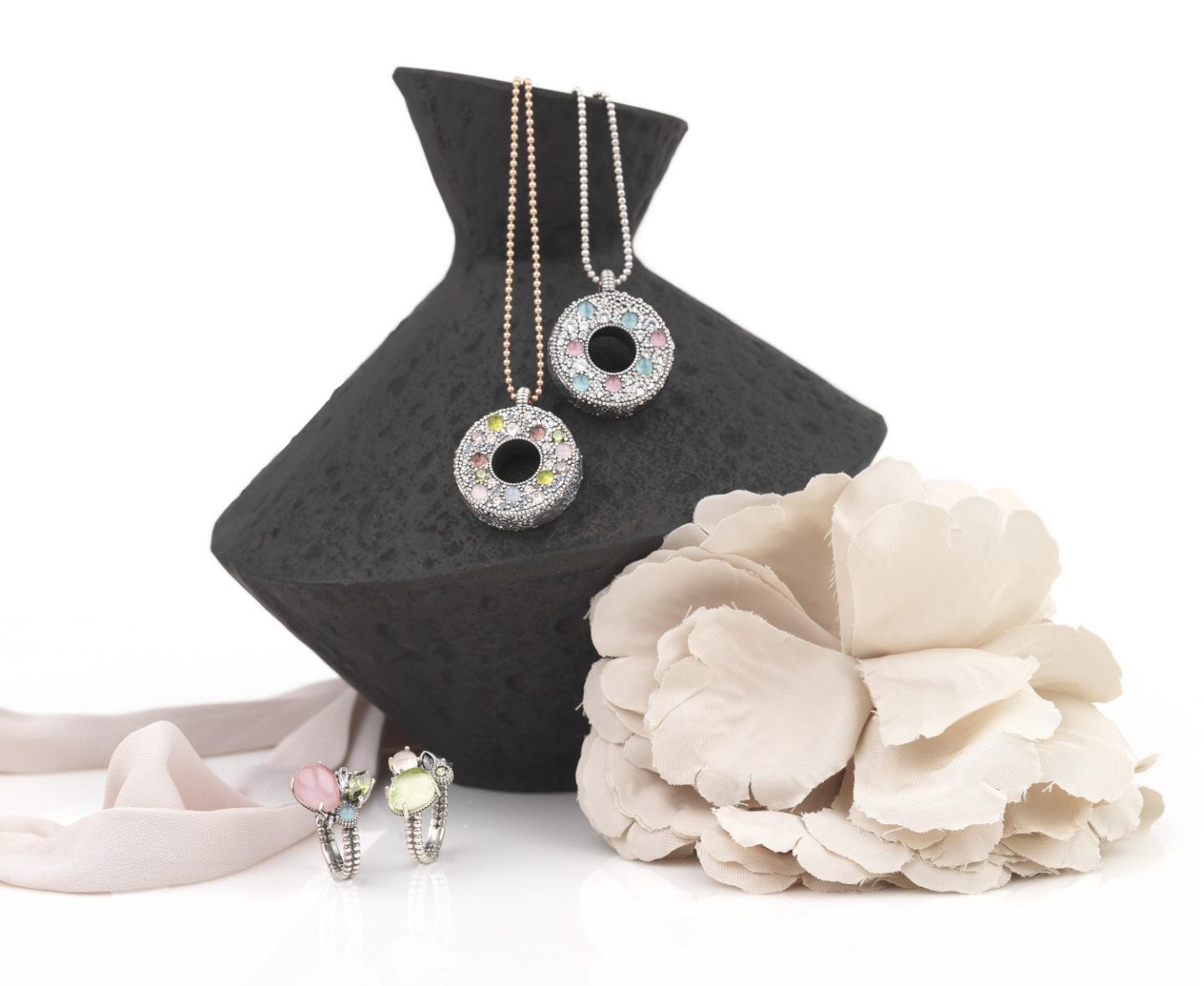 Anillo de plata oxidada 925 con acabado envejecido, símil ópalo rosa y circonitas.