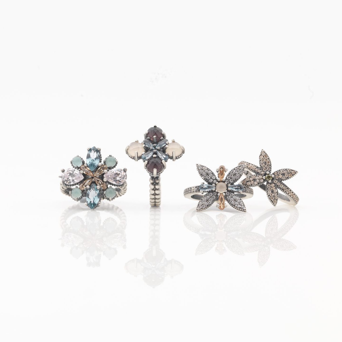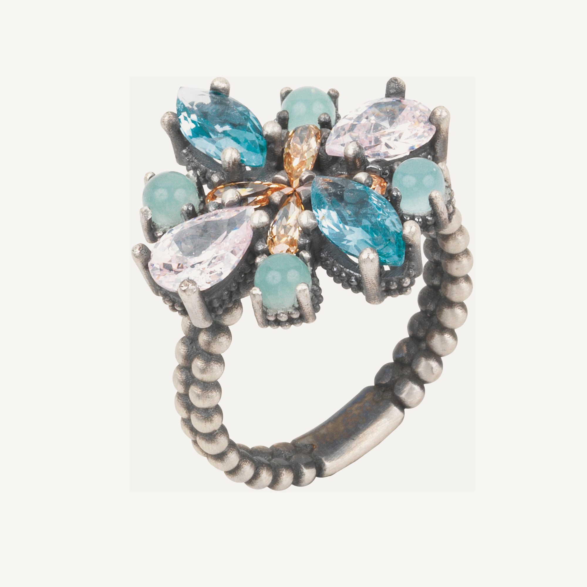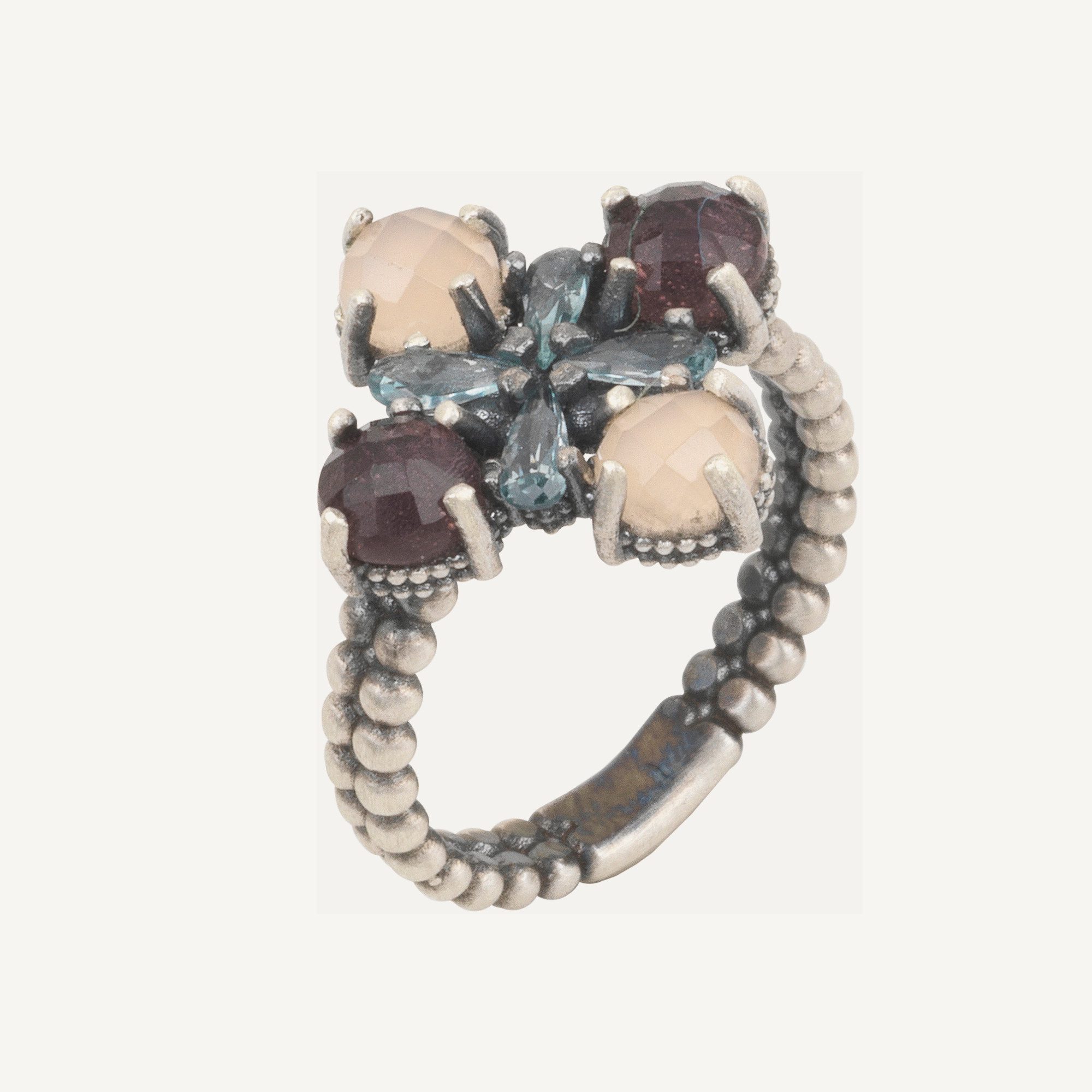 Anillo de plata de ley 925 con acabado envejecido, turmalina rosa, cuarzo rosa y circonitas.