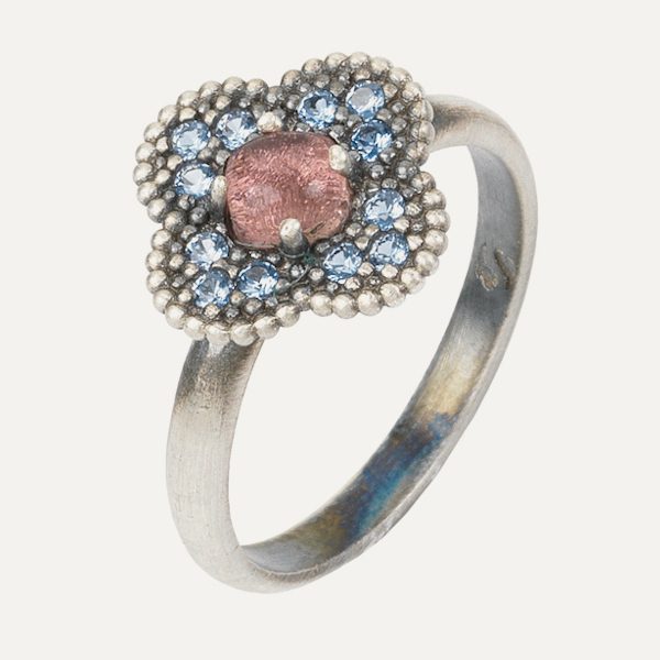 Anillo de plata de ley 925 con acabado envejecido, turmalina rosa y circonitas.