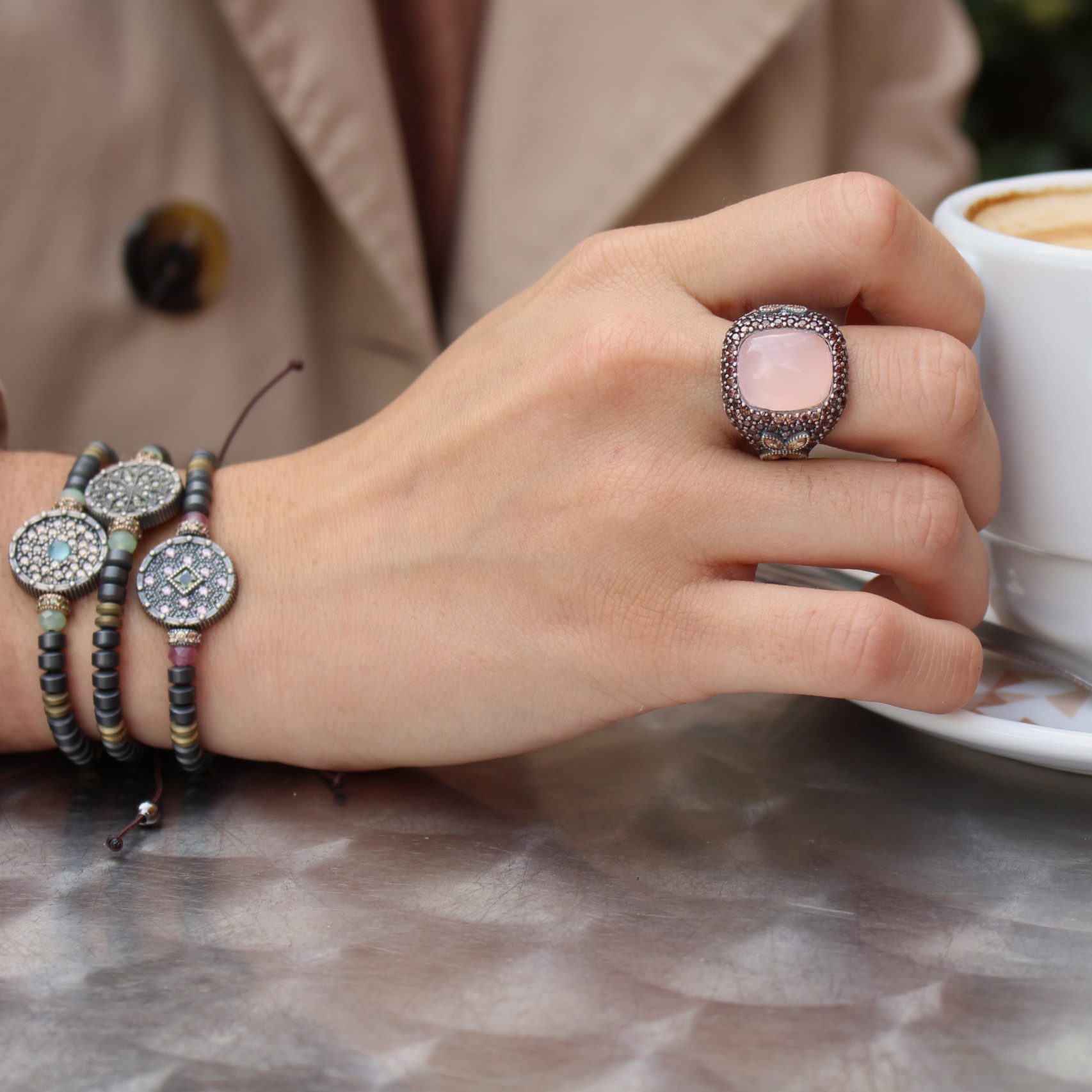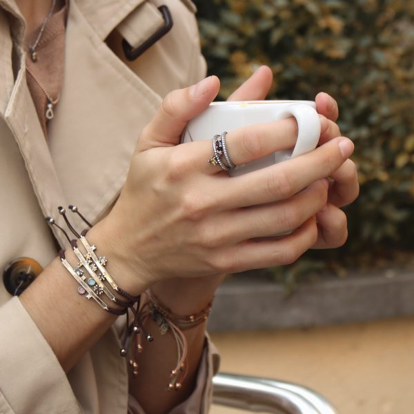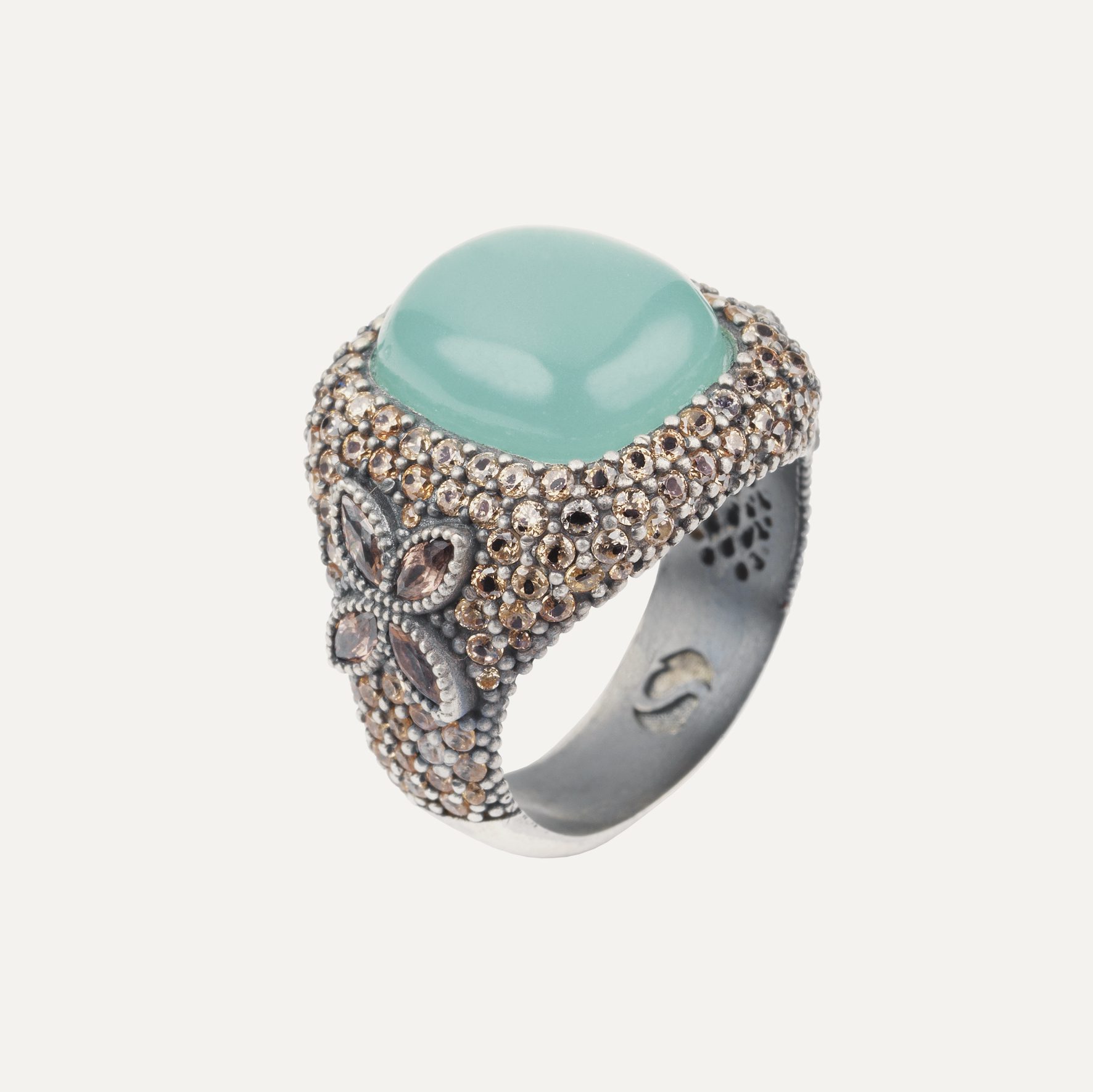 Anillo de plata de ley 925 con acabado envejecido, cuarzo y circonitas en tres colores a elegir.