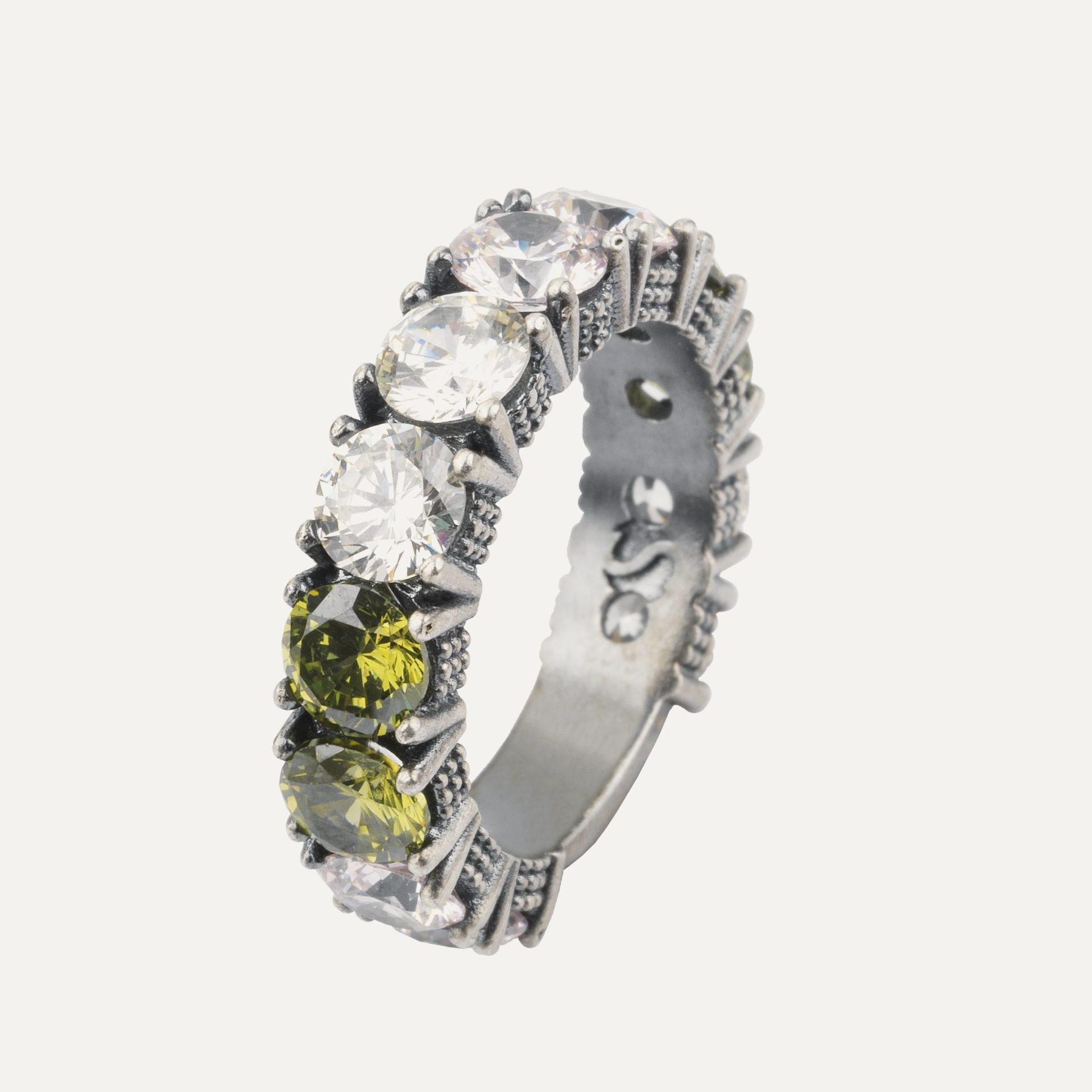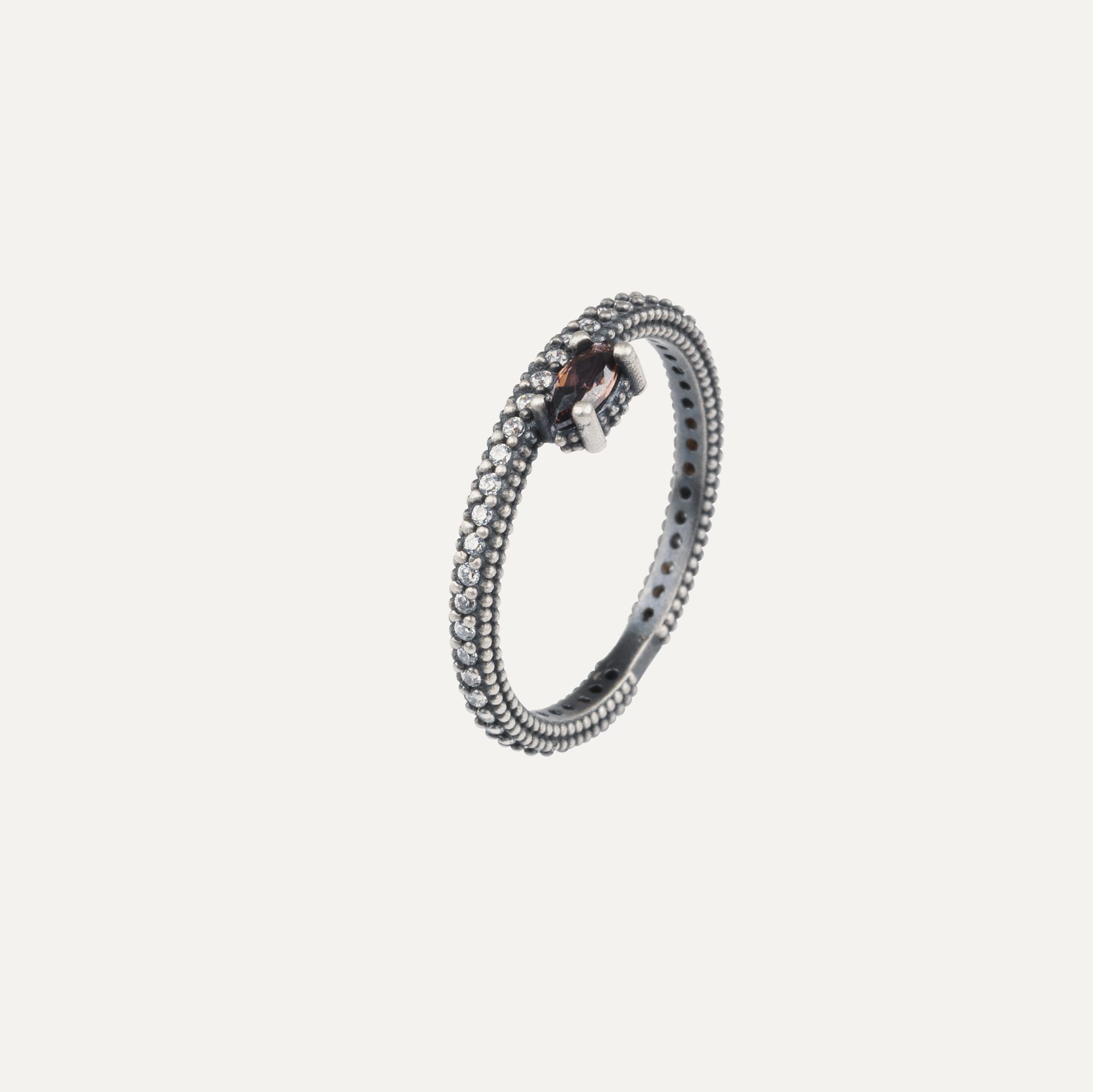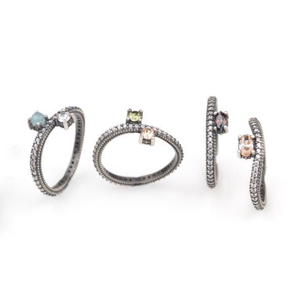 Anillo de plata de ley 925 con acabado envejecido y circonitas, en tres combinaciones de colores a elegir.