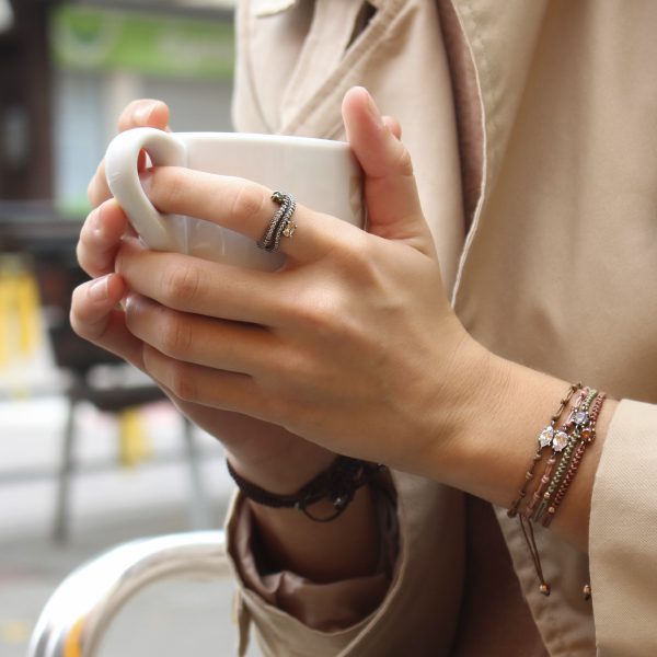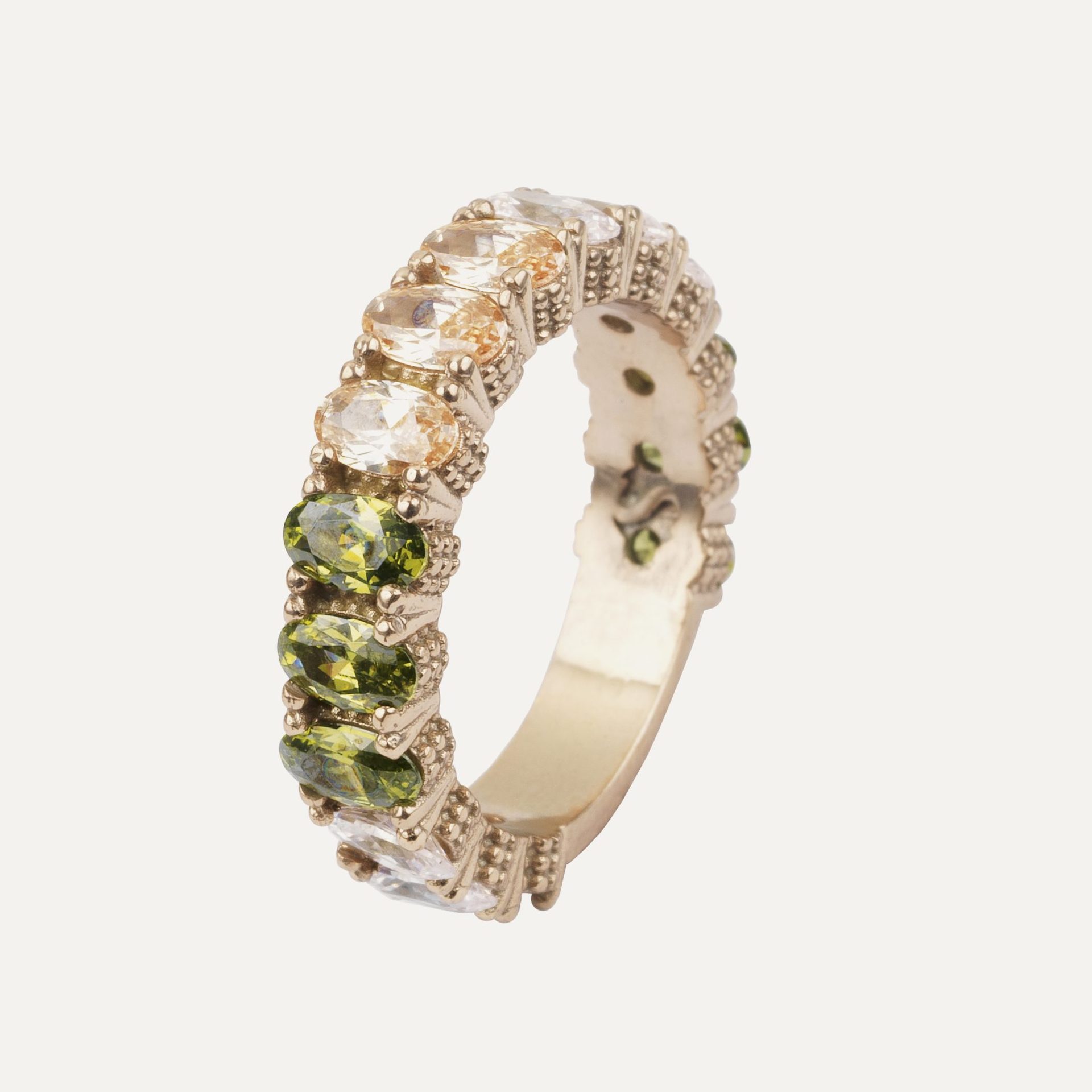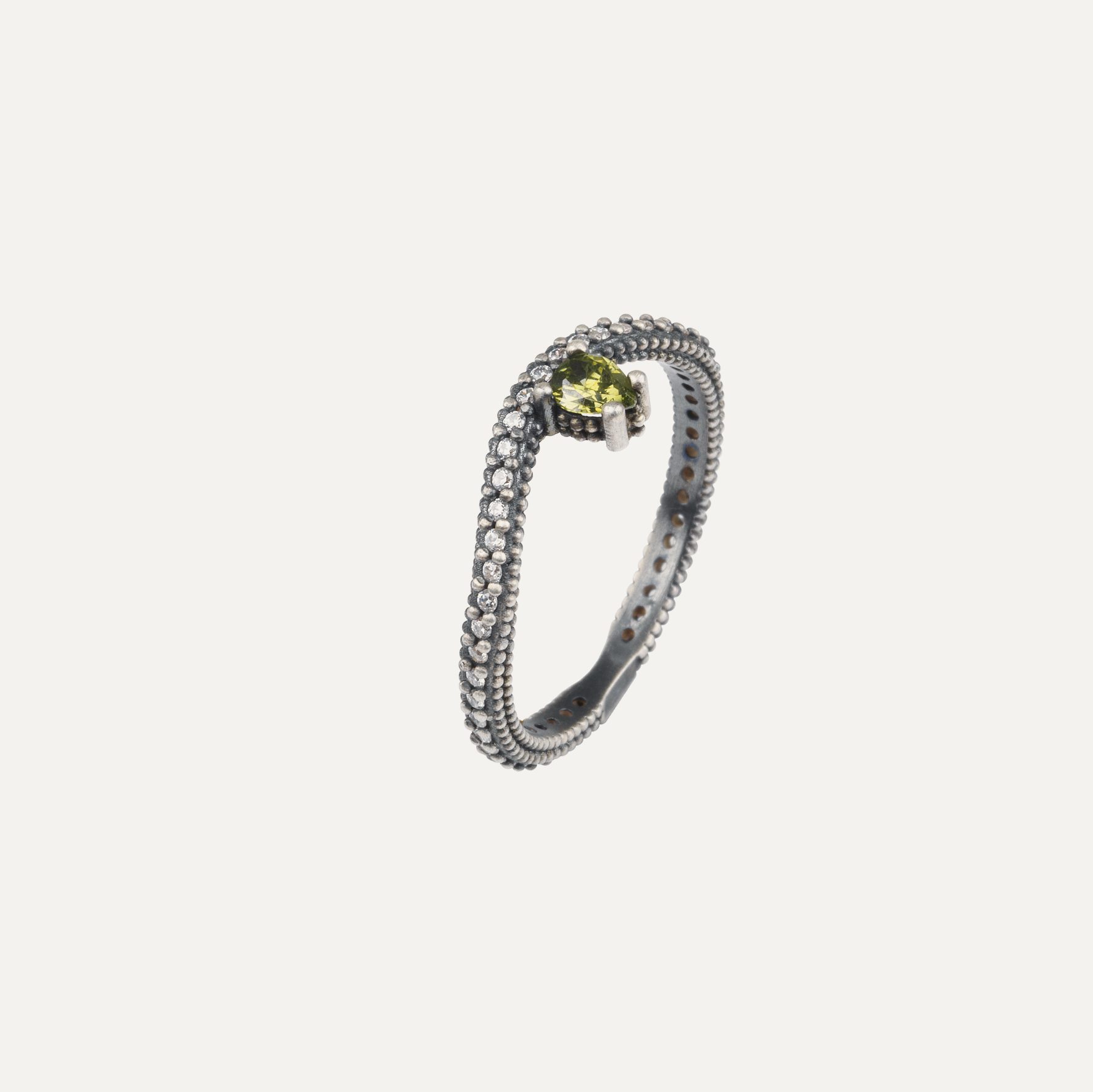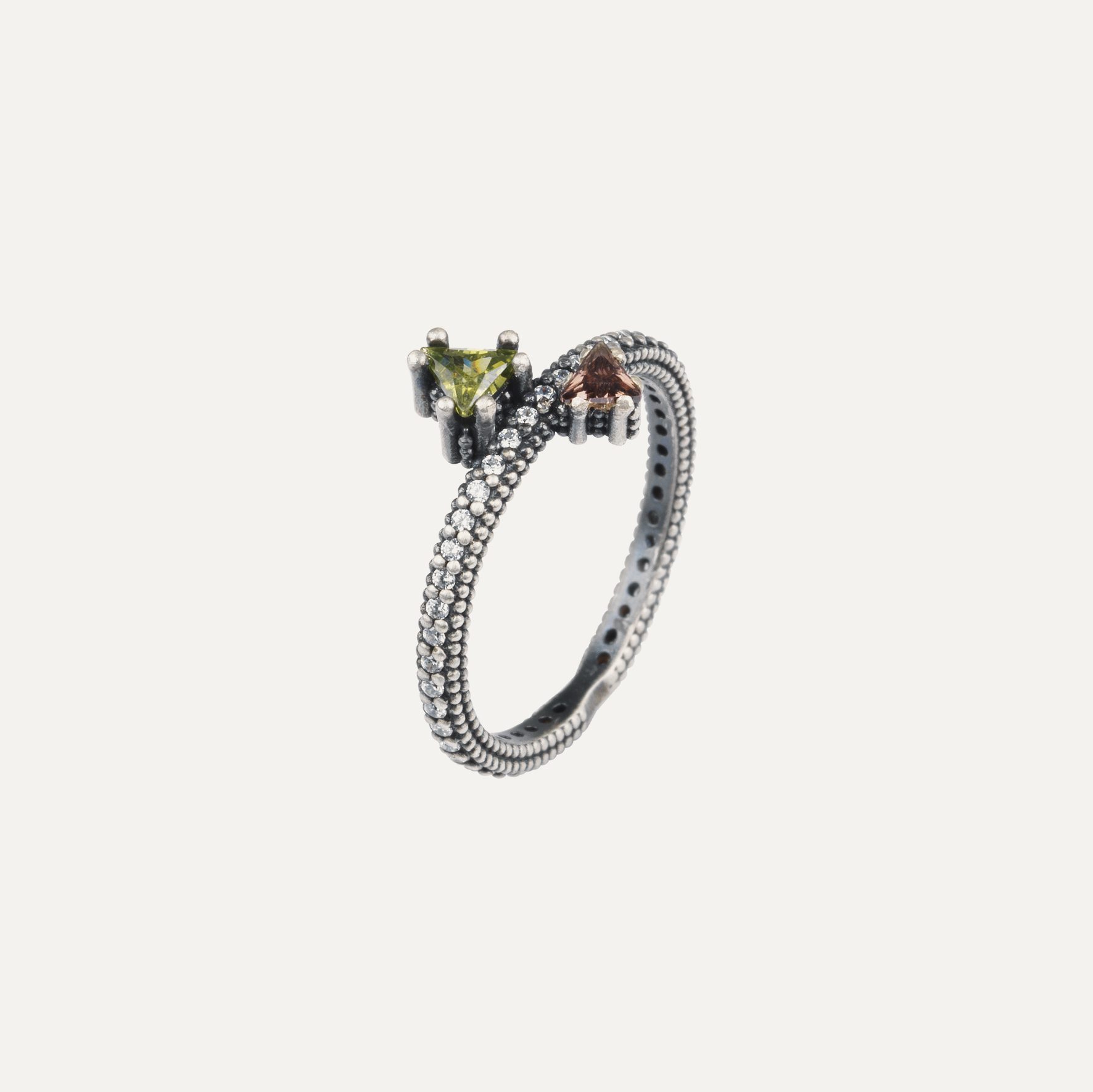Anillo de plata de ley 925 con acabado envejecido y circonitas, en tres combinaciones de colores a elegir.