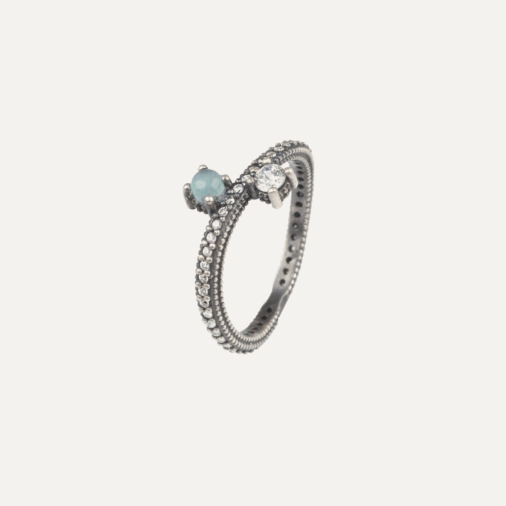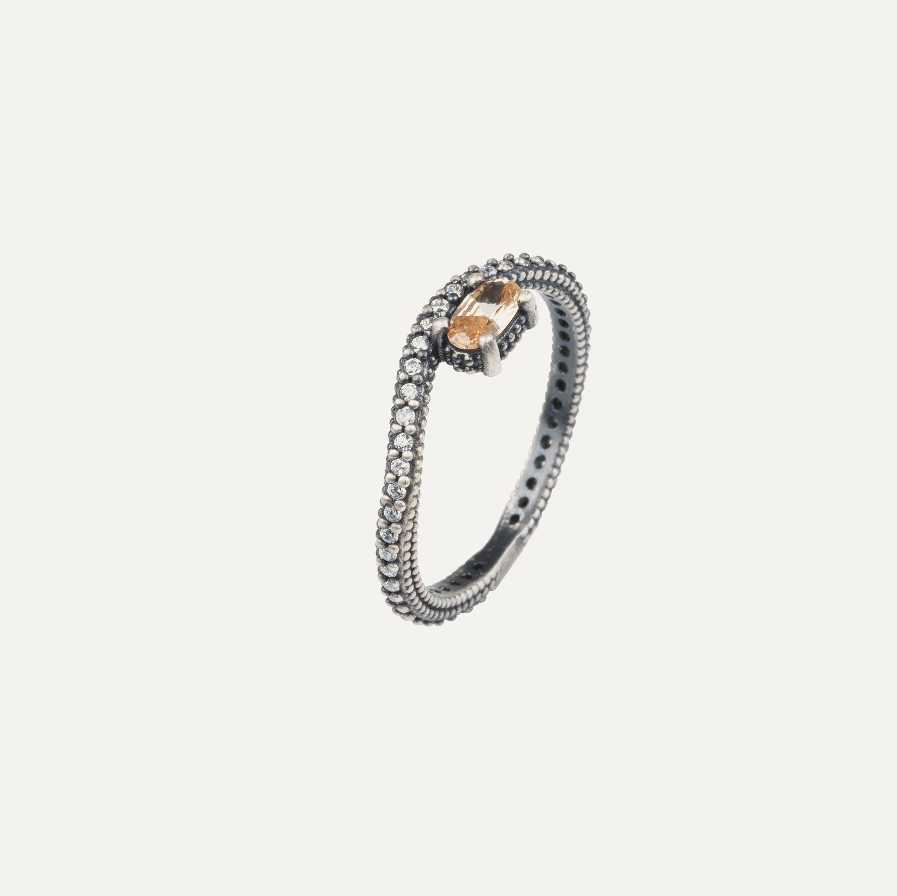 Anillo de plata de ley 925 con acabado envejecido y circonitas.
