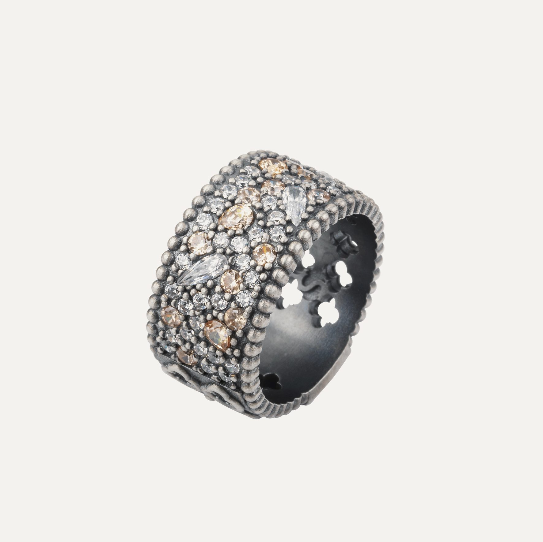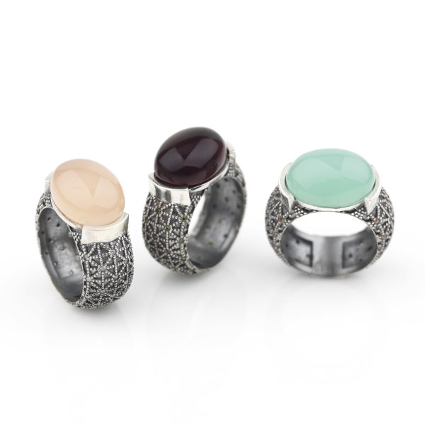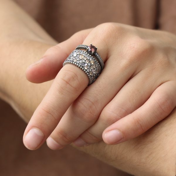 Anillo de plata de ley 925 con acabado envejecido y circonitas, en tres combinaciones de colores a elegir.
