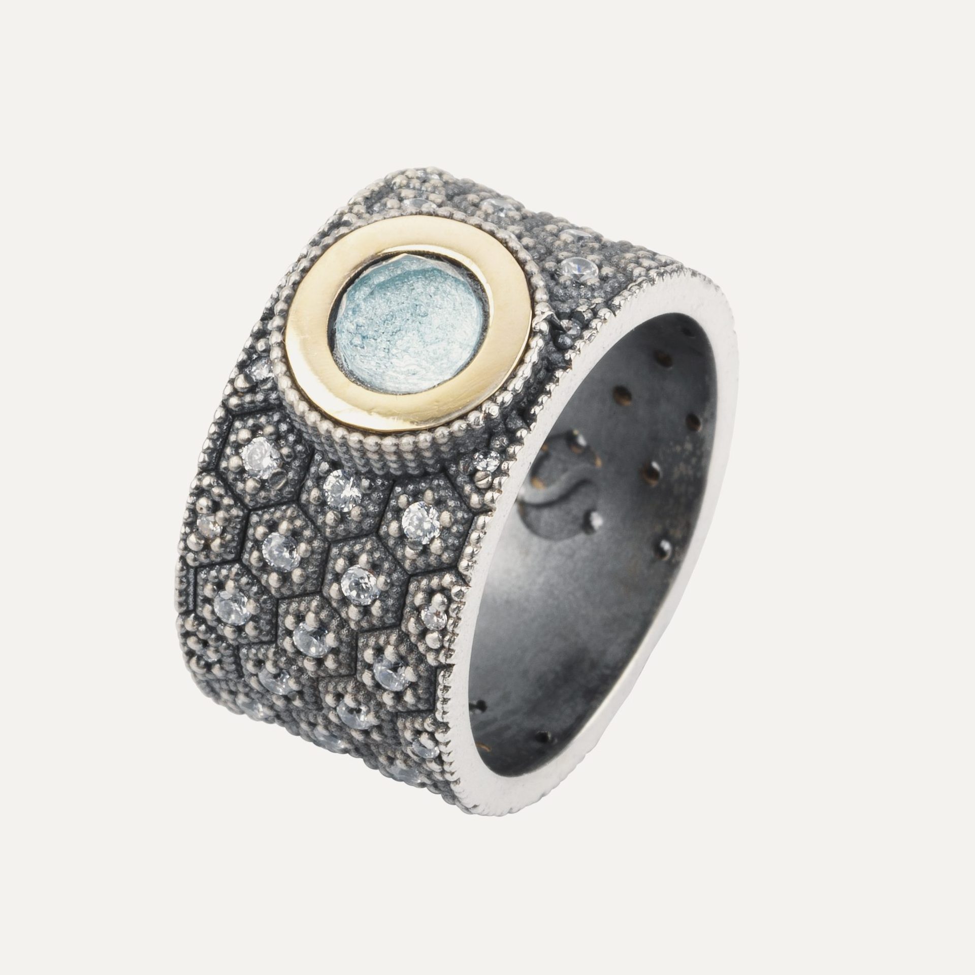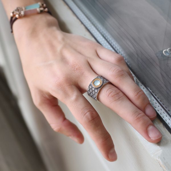 Anillo de plata de ley 925 con acabado envejecido, oro de 9kt, cuarzo y circonitas, en tres combinaciones a elegir.
