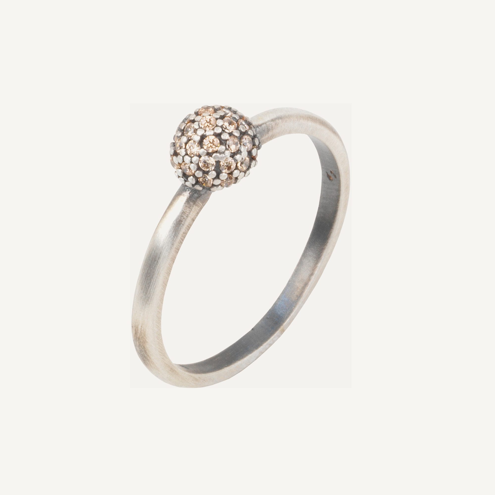 Anillo de plata de ley 925 con acabado envejecido, aguamarina y circonitas color cava y talla brillante clavadas a mano.
