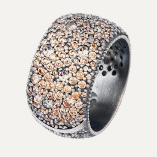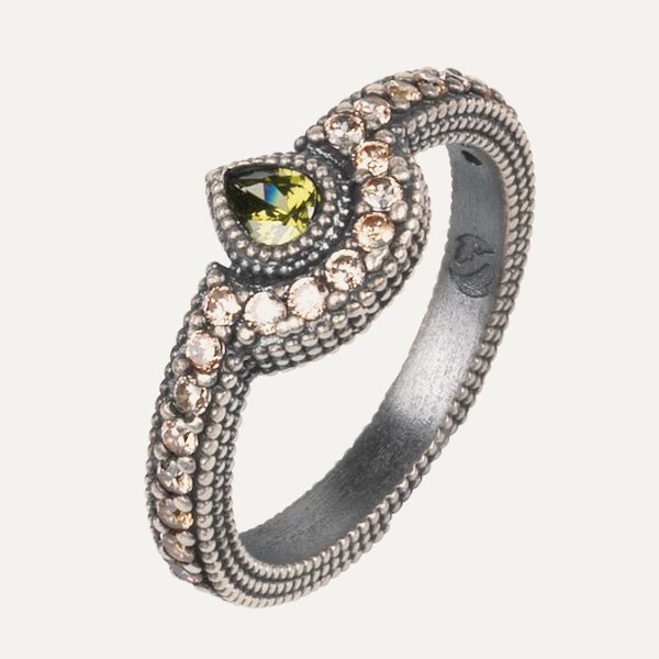 Anillo de plata de ley 925 con acabado envejecido y circonitas cava engastadas en un delicado patrón calado.