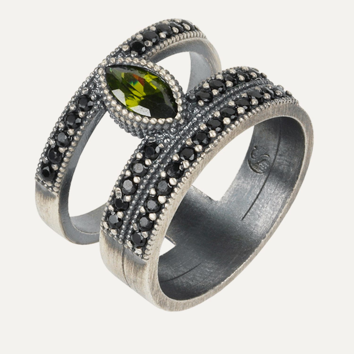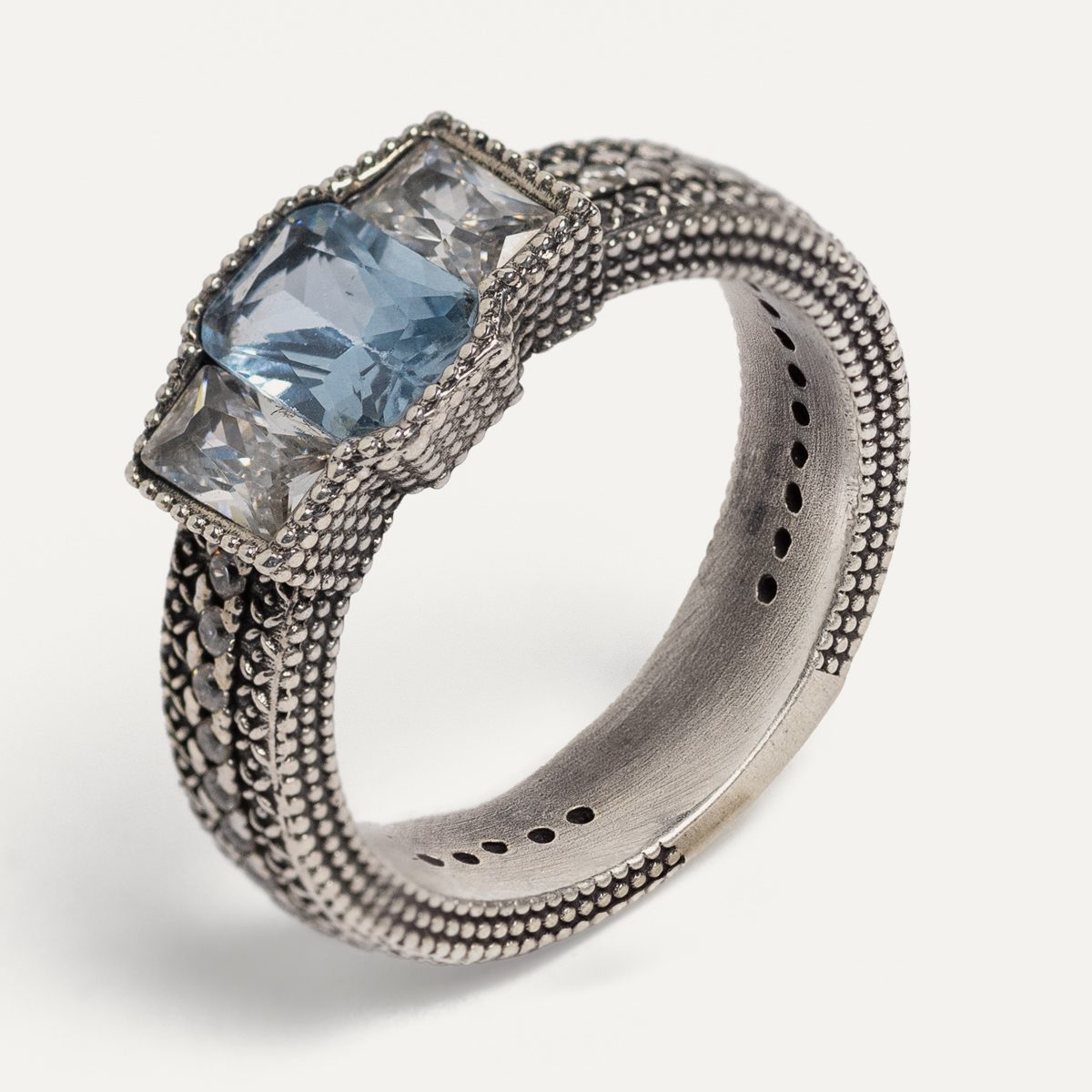 Anillo de plata de ley 925 con acabado envejecido y circonitas.