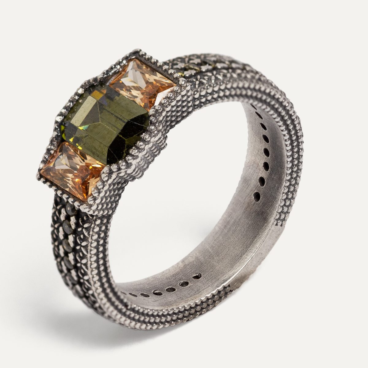 Anillo de plata oxidada 925 con acabado envejecido, cuarzo y circonitas, en tres colores a elegir.
