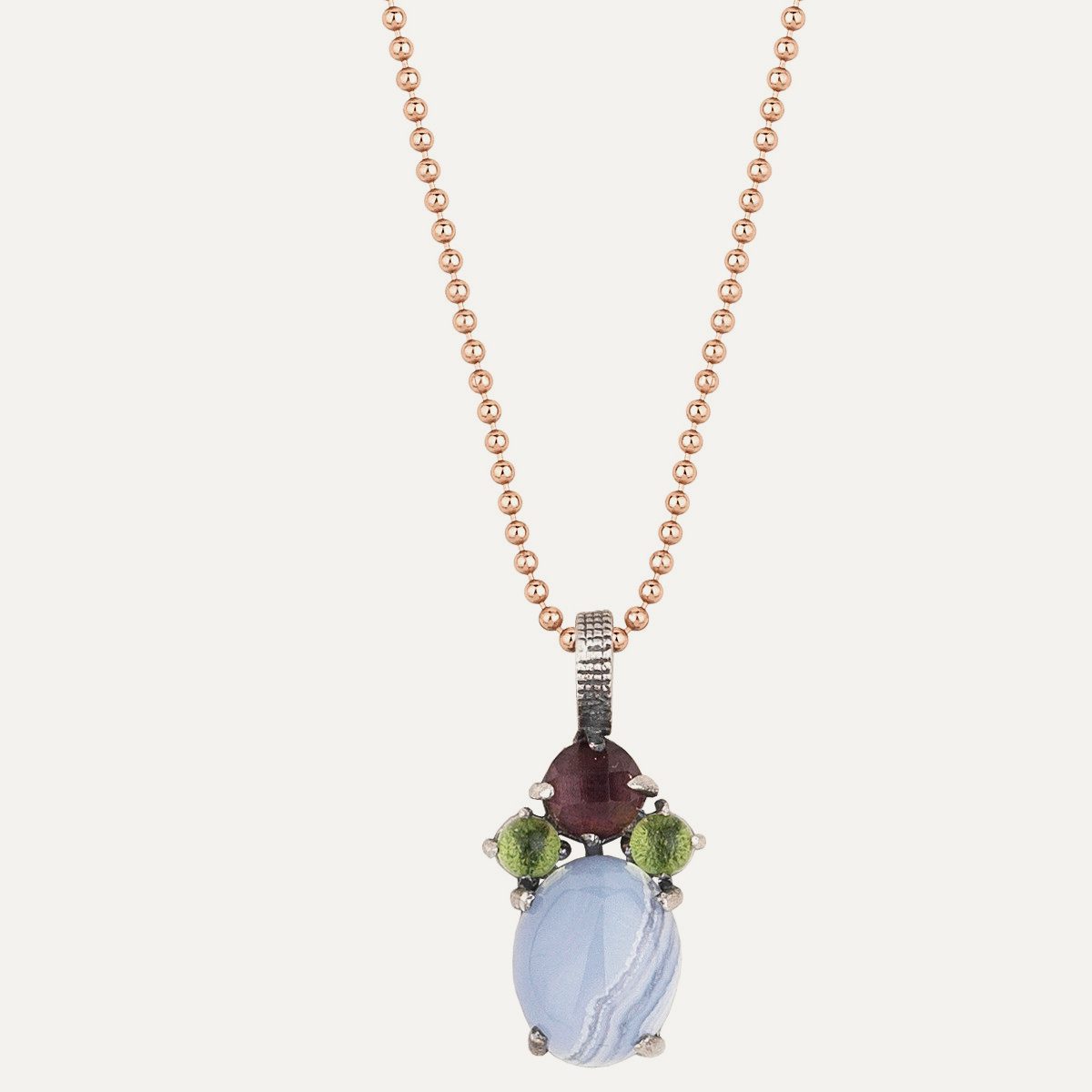 Colgante de plata de ley 925 con acabado envejecido, turmalina rosa, peridoto y agata azul.