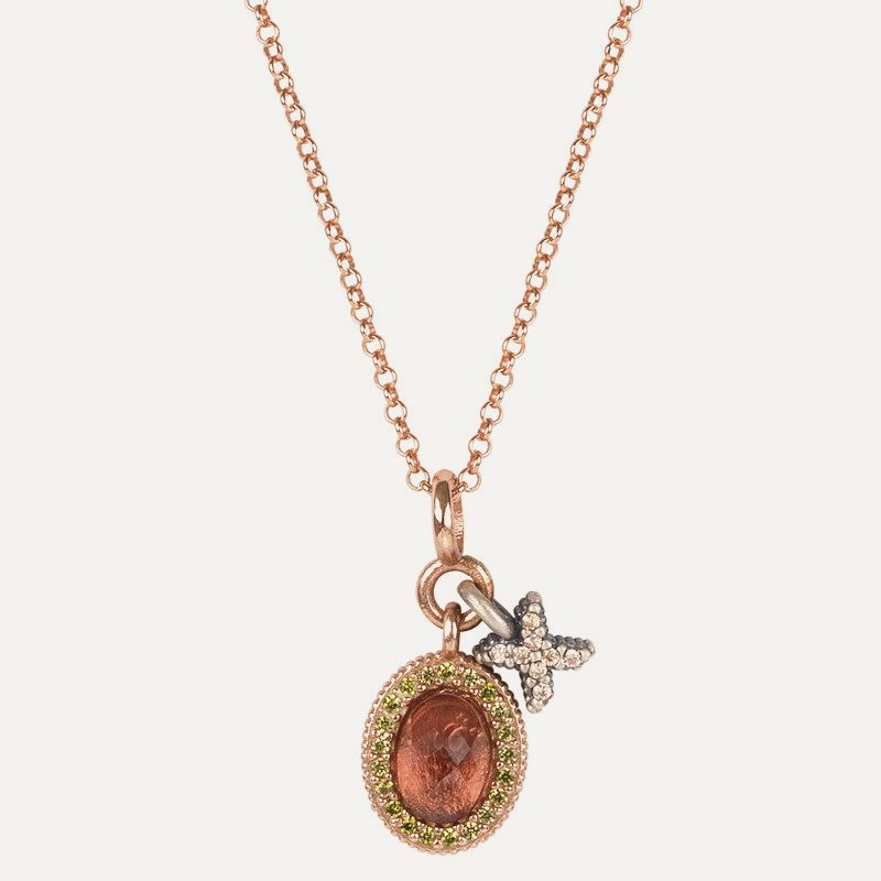 Colgante de plata de ley 925 con cadena tipo rosario y cadena adicional de eslabones, ambas en tono oro rosa, decorado con circonitas color cava.