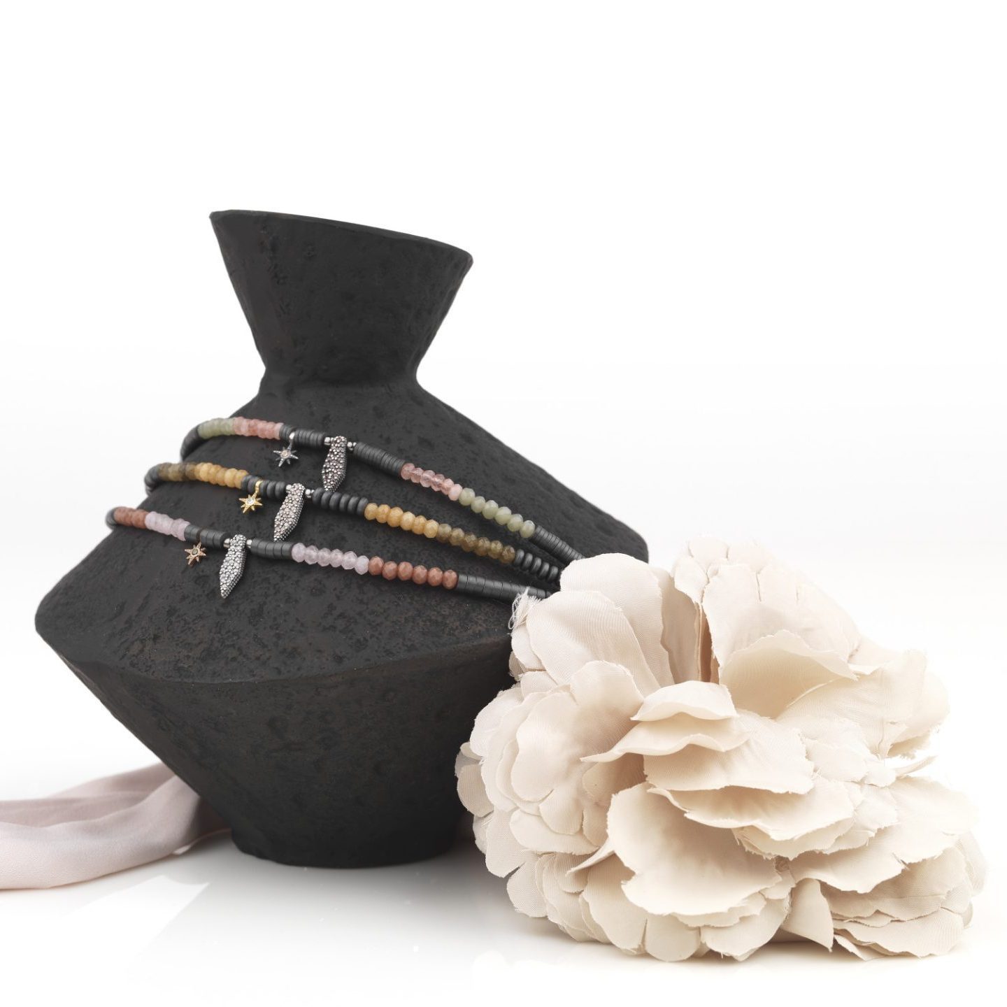 Colgante de plata de ley 925, ágataqs, onix, cuentas de cristal, hematites, circonitas y acero. Disponible en tres combinaciones de colores.