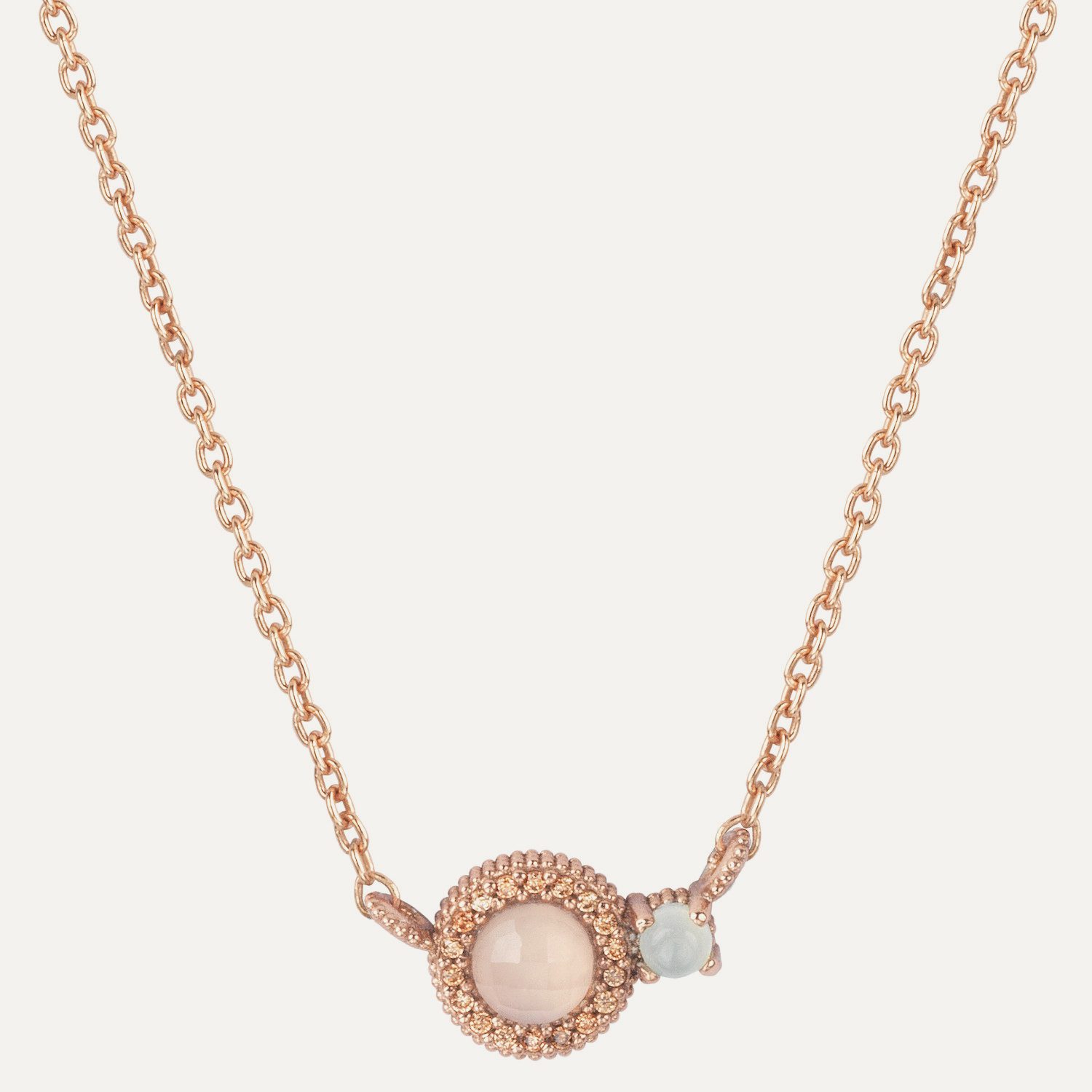 Colgante de plata de ley 925 con baño de oro rosa de 24 kt, cuarzo rosa, calcedonia y circonitas.