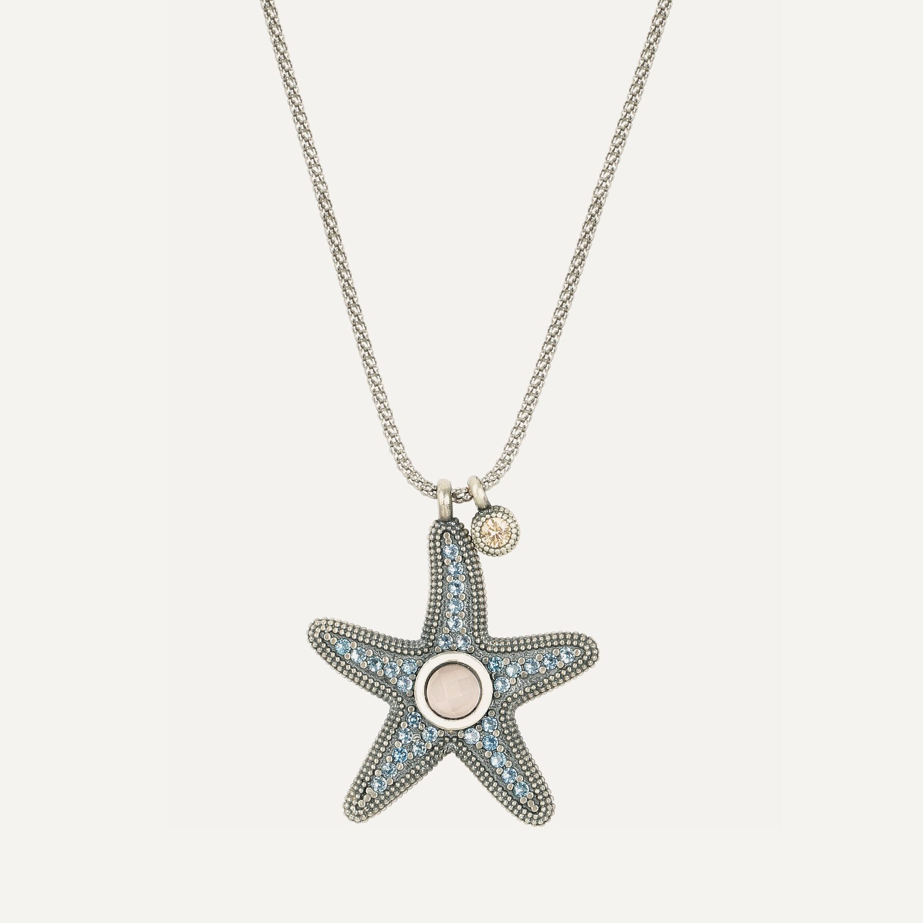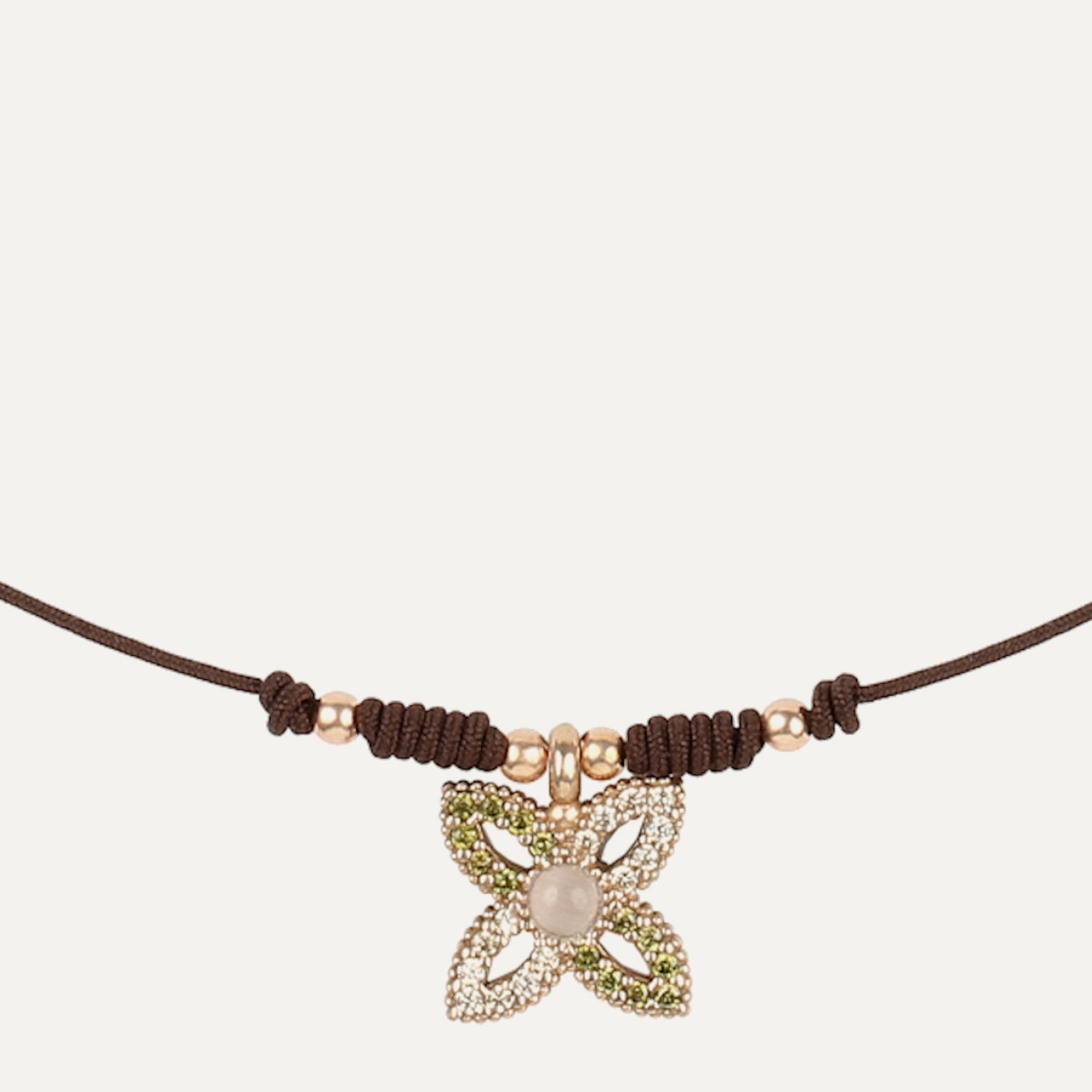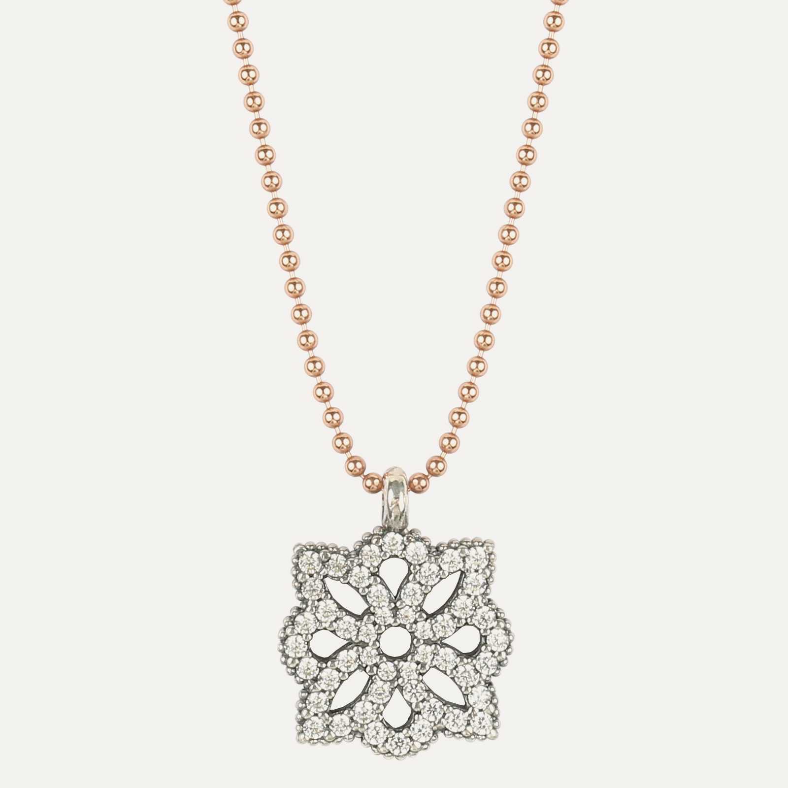 Colgante de plata de ley 925 con cuarzo rosa y circonitas, en dos posibles acabados: plata envejecida, o baño de oro rosa de 24 kt.