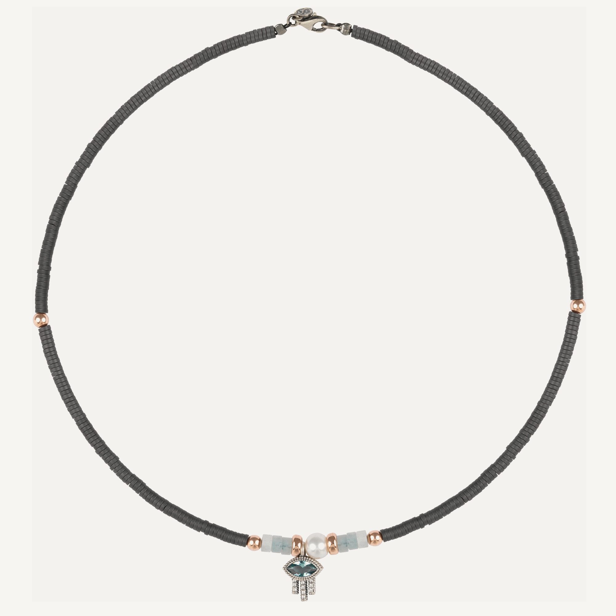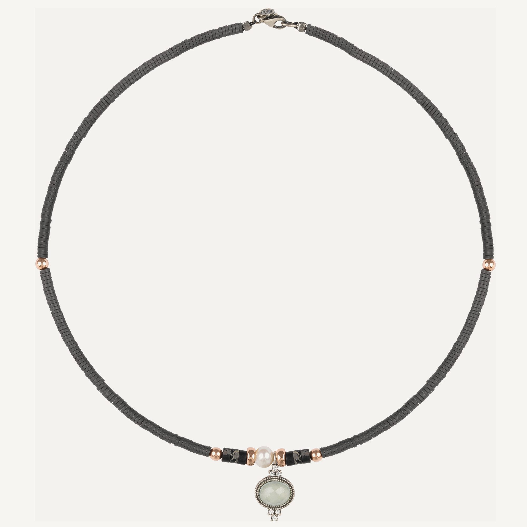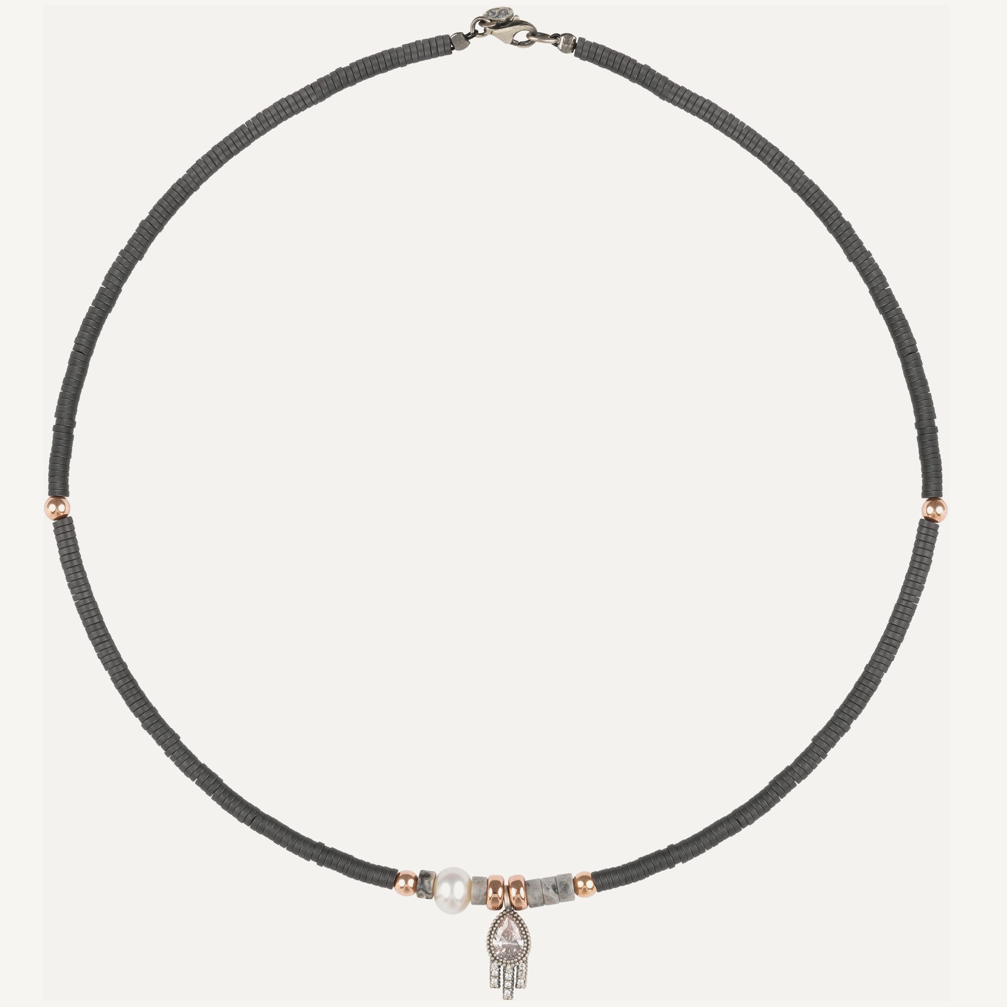 Colgante de plata de ley 925, jaspe gris, jade, perla barroca, circonitas, hematites y acero.