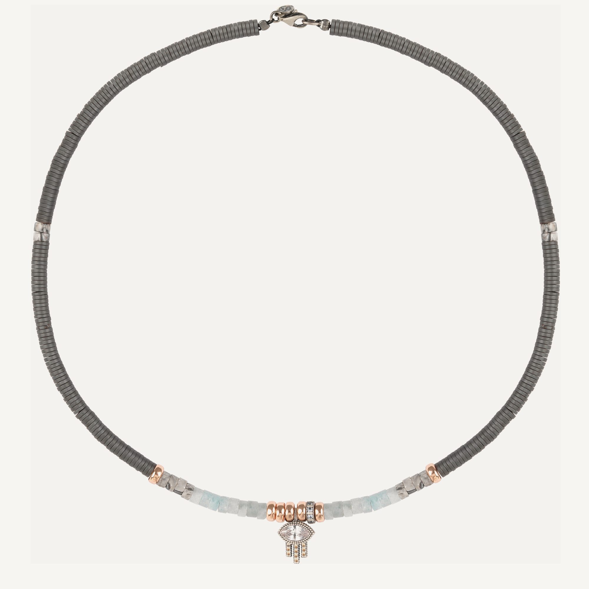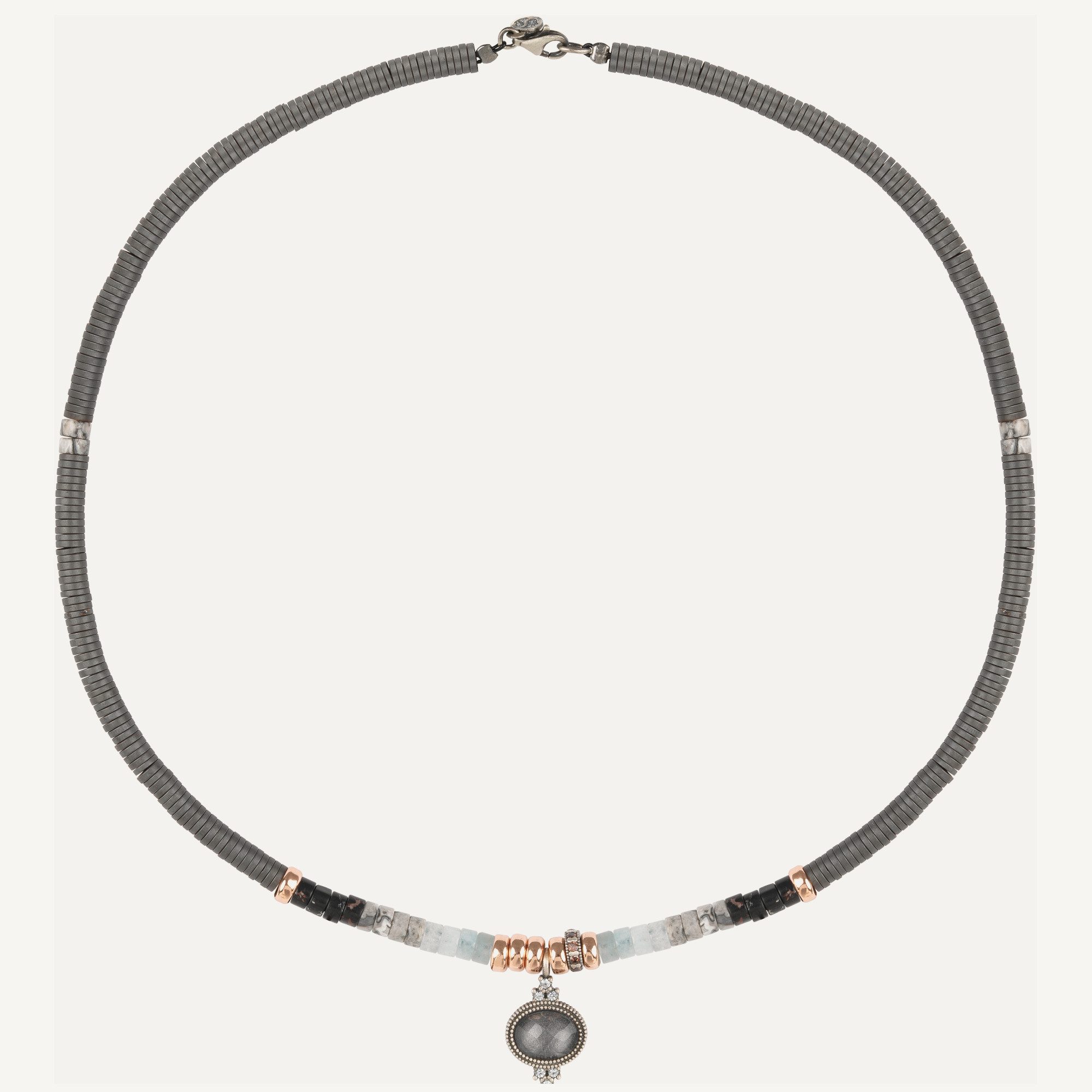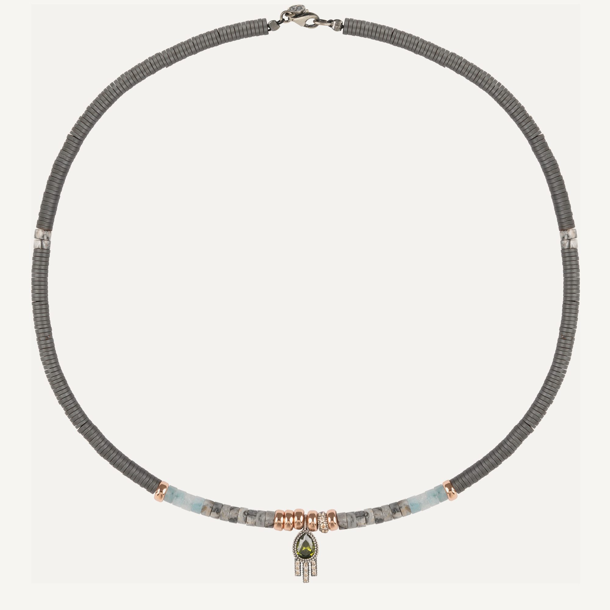Colgante de plata de ley 925, jaspe gris, jade, circonitas, hematites y acero.