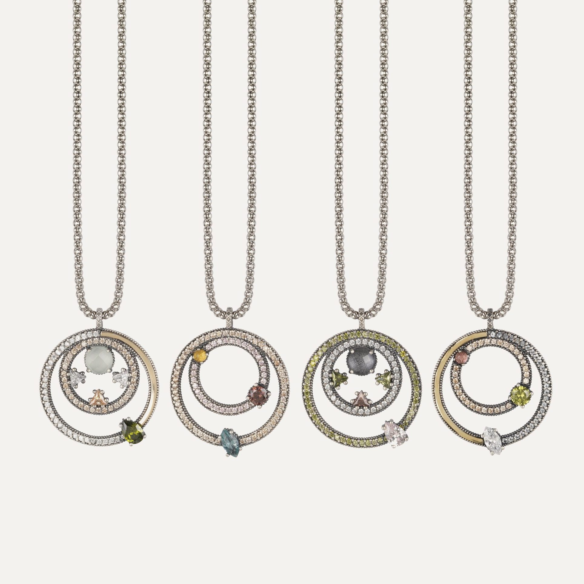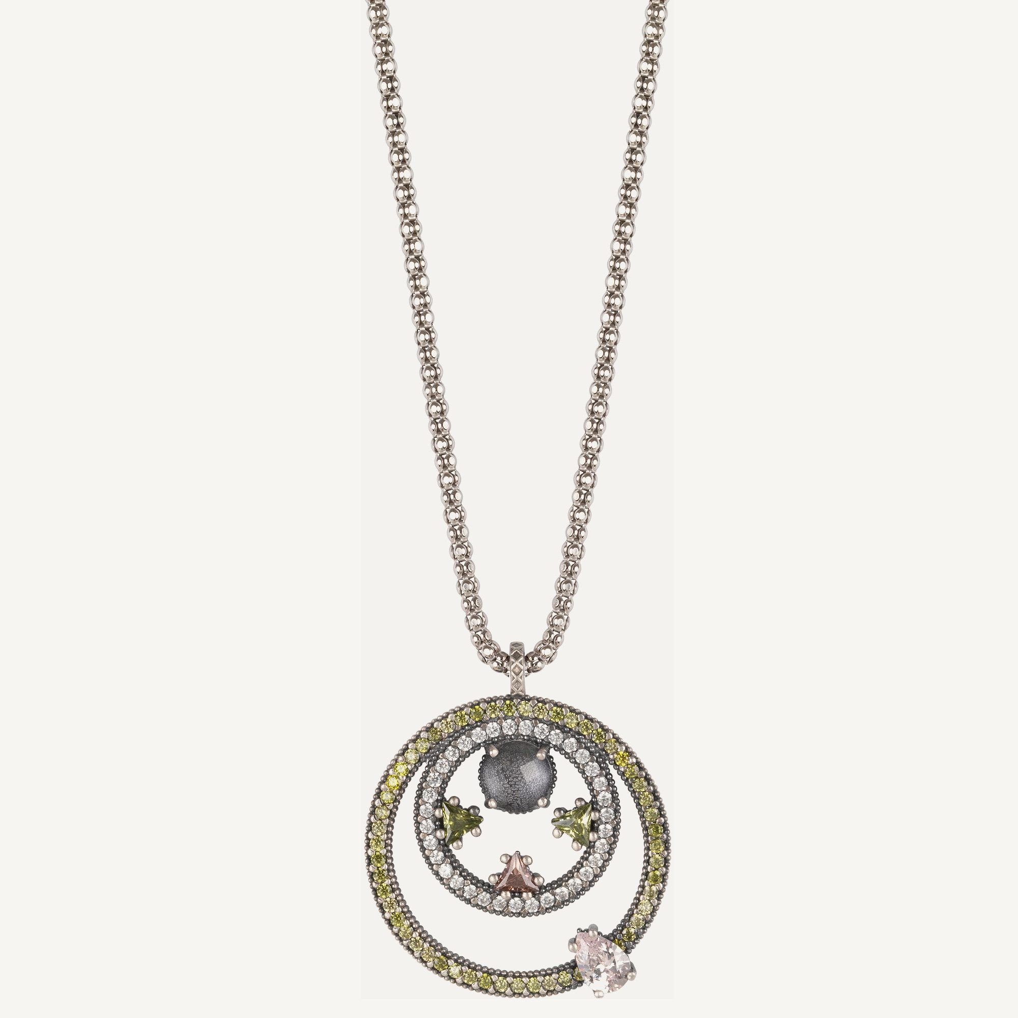 Colgante de plata de ley 925, cuarzo gris, jaspe gris, negro, circonitas, hematites y acero.