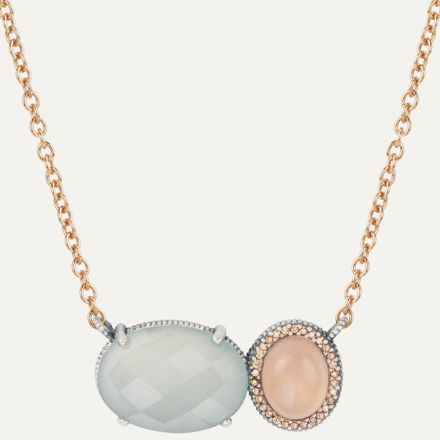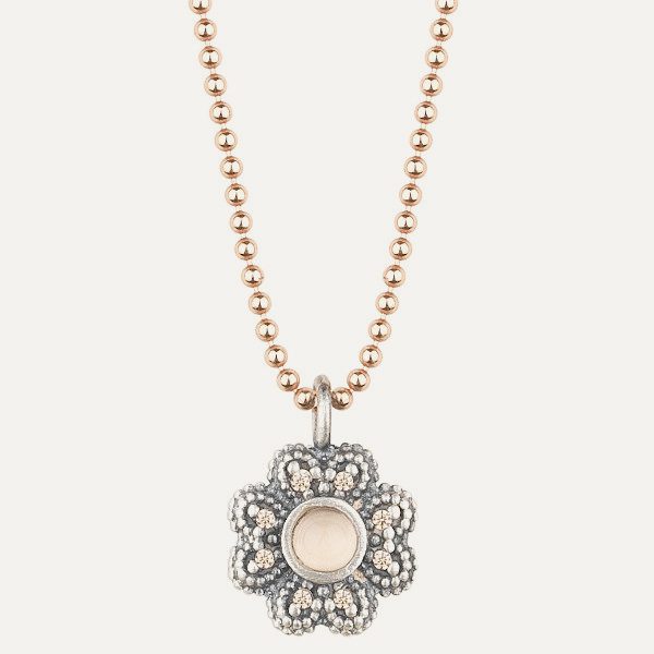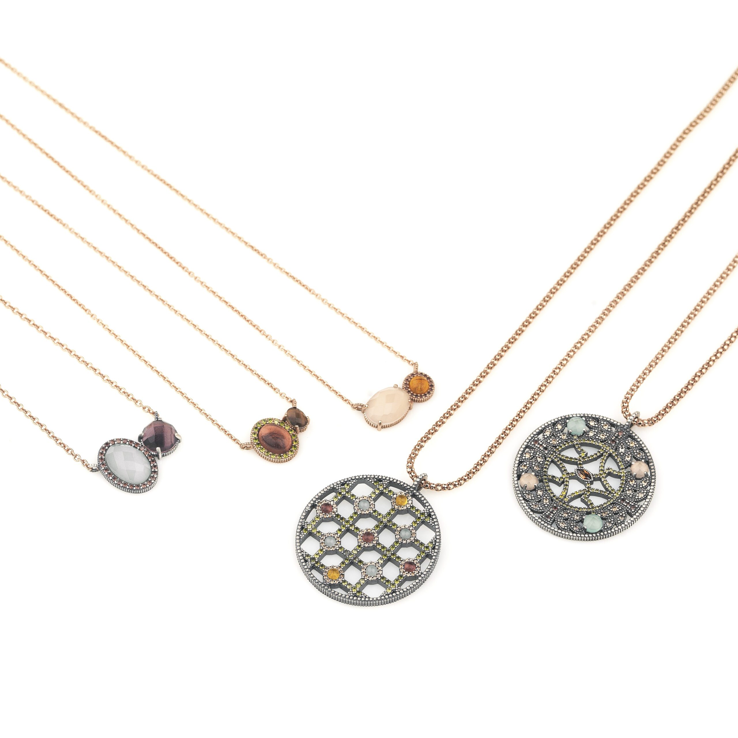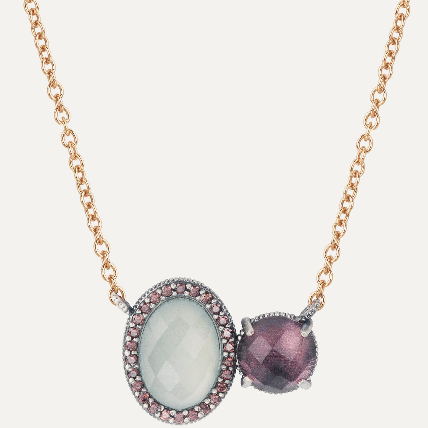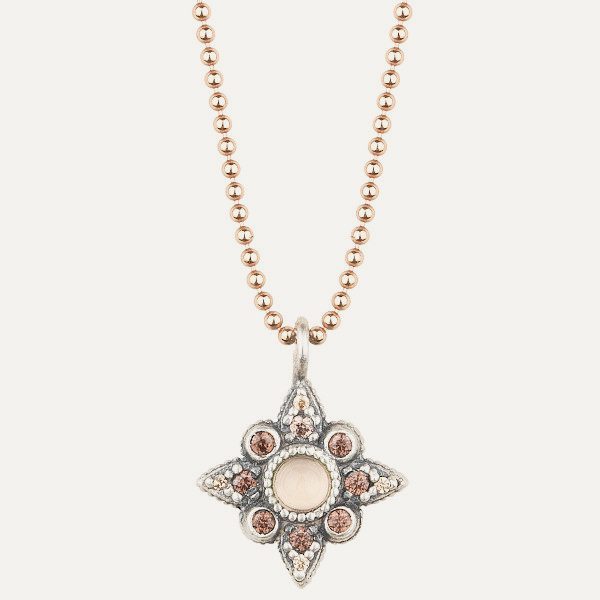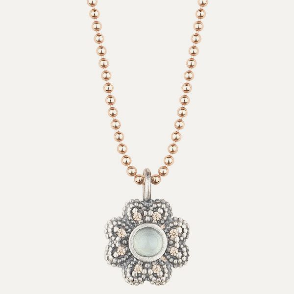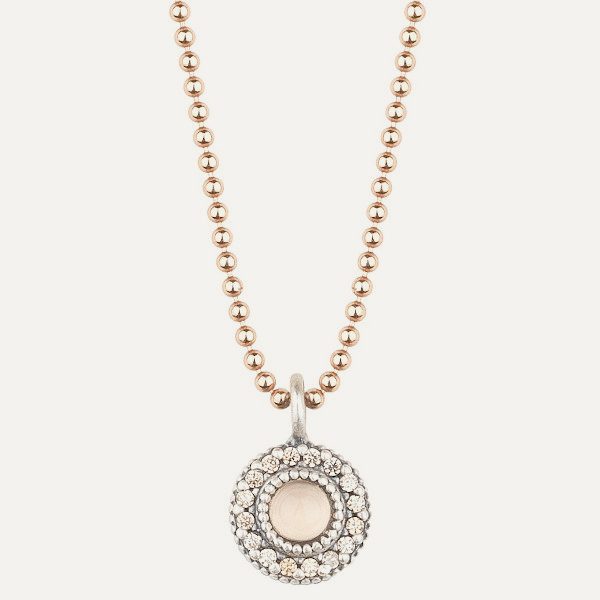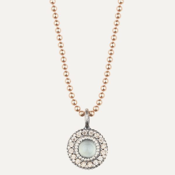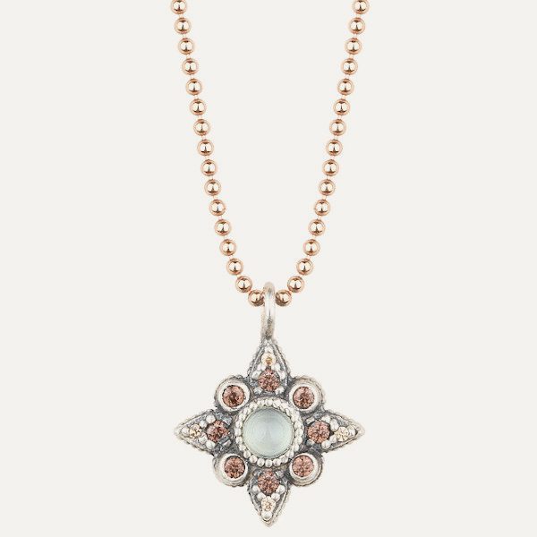 Colgante de plata de ley 925 con acabado envejecido, calcedonia, cuarzo rosa y circonitas.