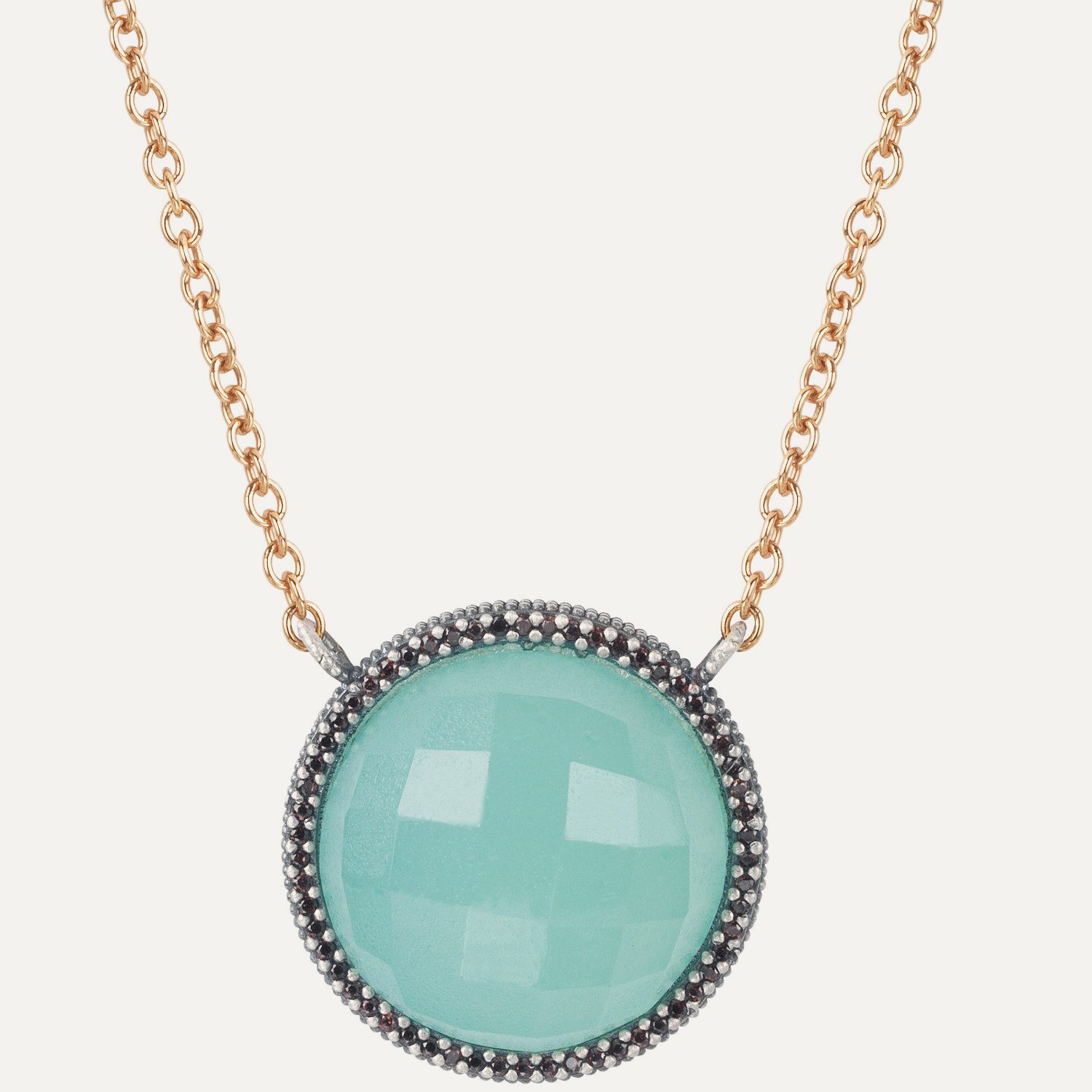 Colgante de plata de ley 925 con acabado envejecido, calcedonia y circonitas.