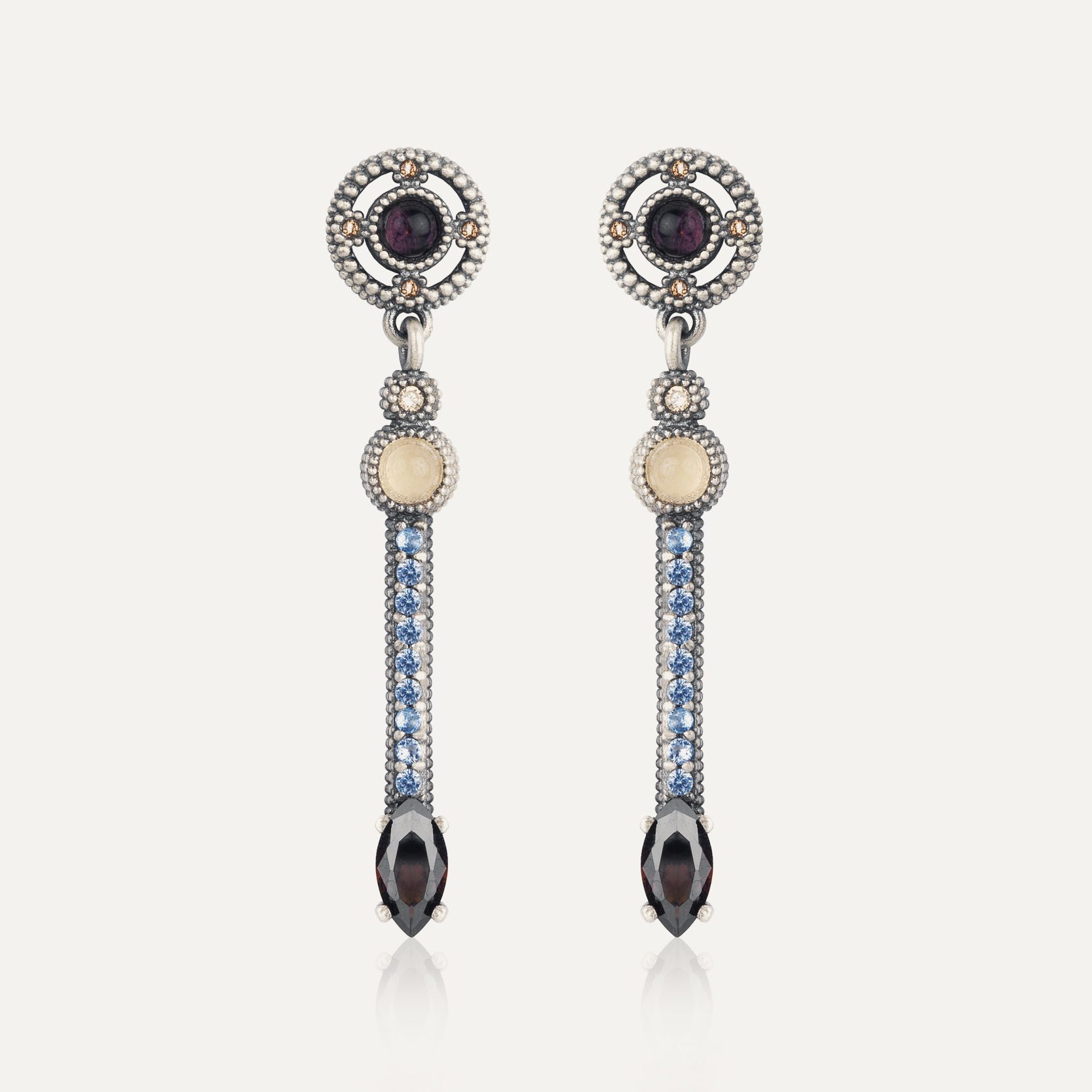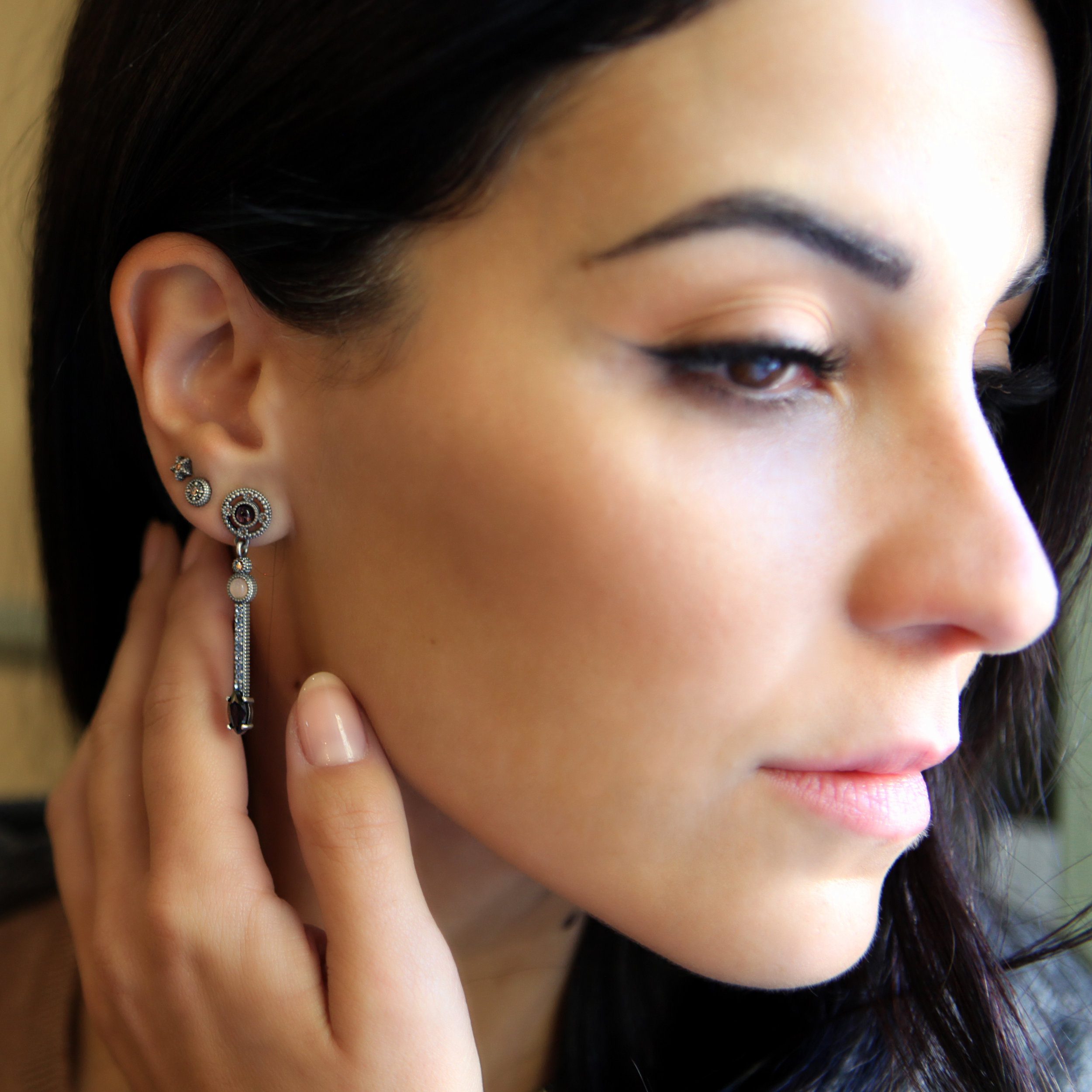 Pendientes de plata de ley 925 con acabado envejecido, turmalina rosa, cuarzo rosa y circonitas.