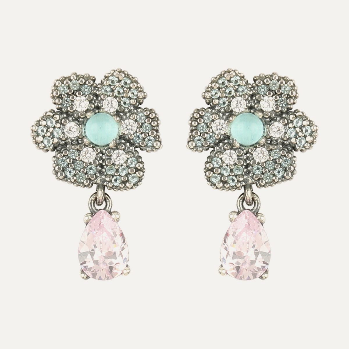 Pendientes de plata de ley 925 con cuarzo rosa, cuarzo color aguamarina y circonitas.