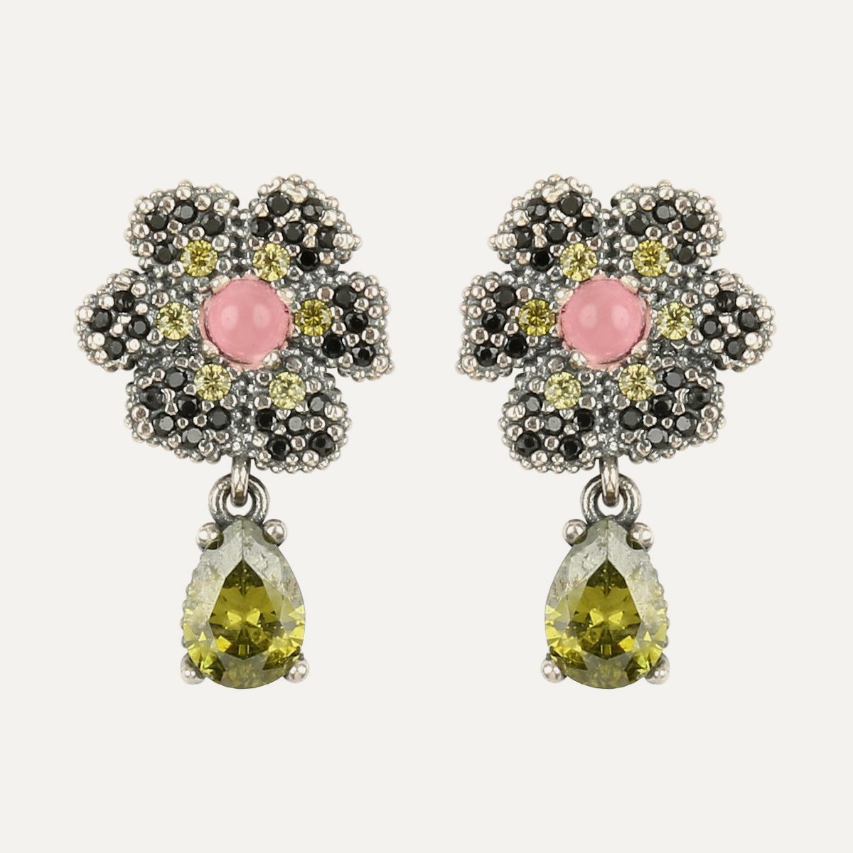 Pendientes de plata de ley 925 con cuarzo rosa y circonitas, en dos combinaciones de colores a elegir.