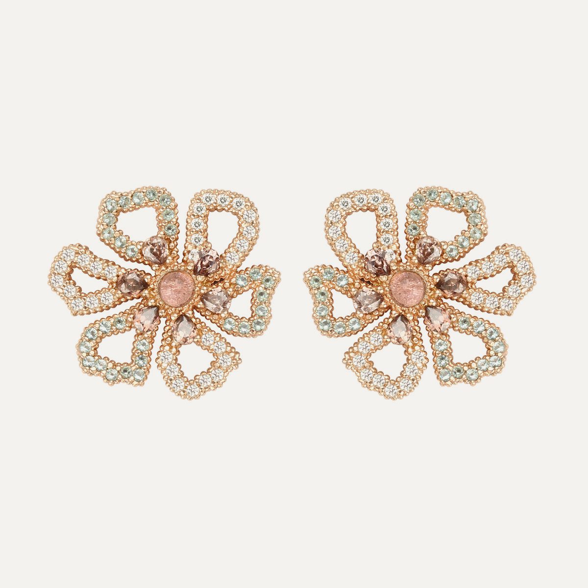 Pendientes de plata de ley 925 con baño de oro rosa de 24kt, perla, cuarzo y circonitas.
