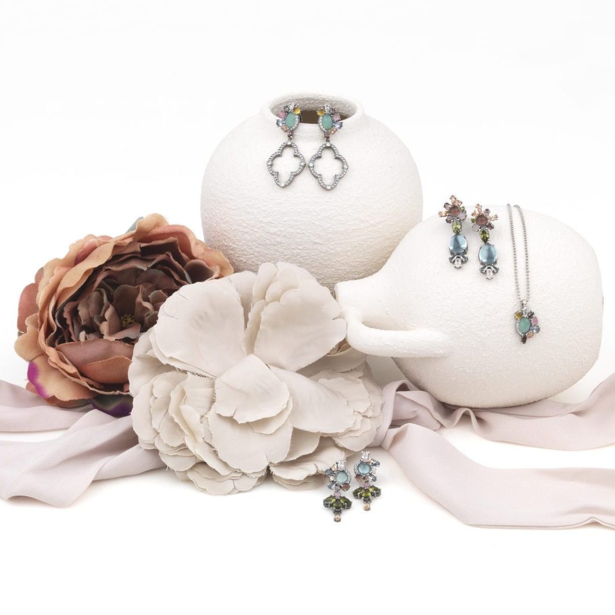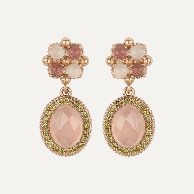 Pendientes de plata de ley 925 con baño de oro rosa de 24kt, cuarzo y circonitas. Tres combinaciones diferentes a elegir.