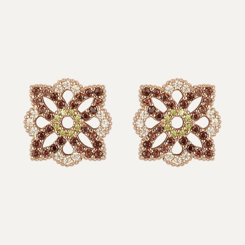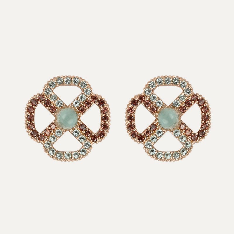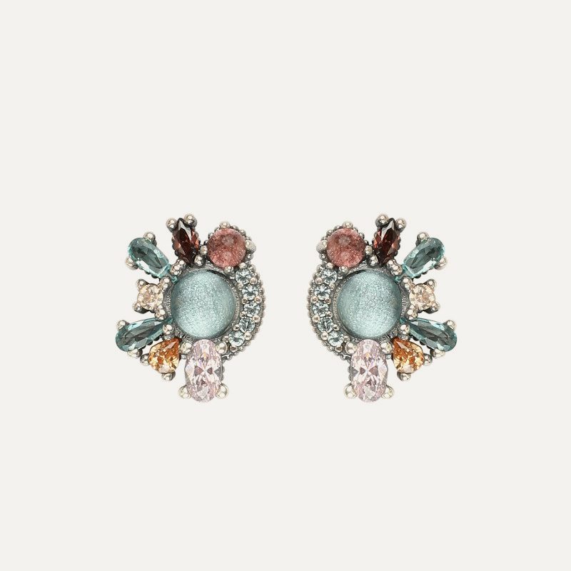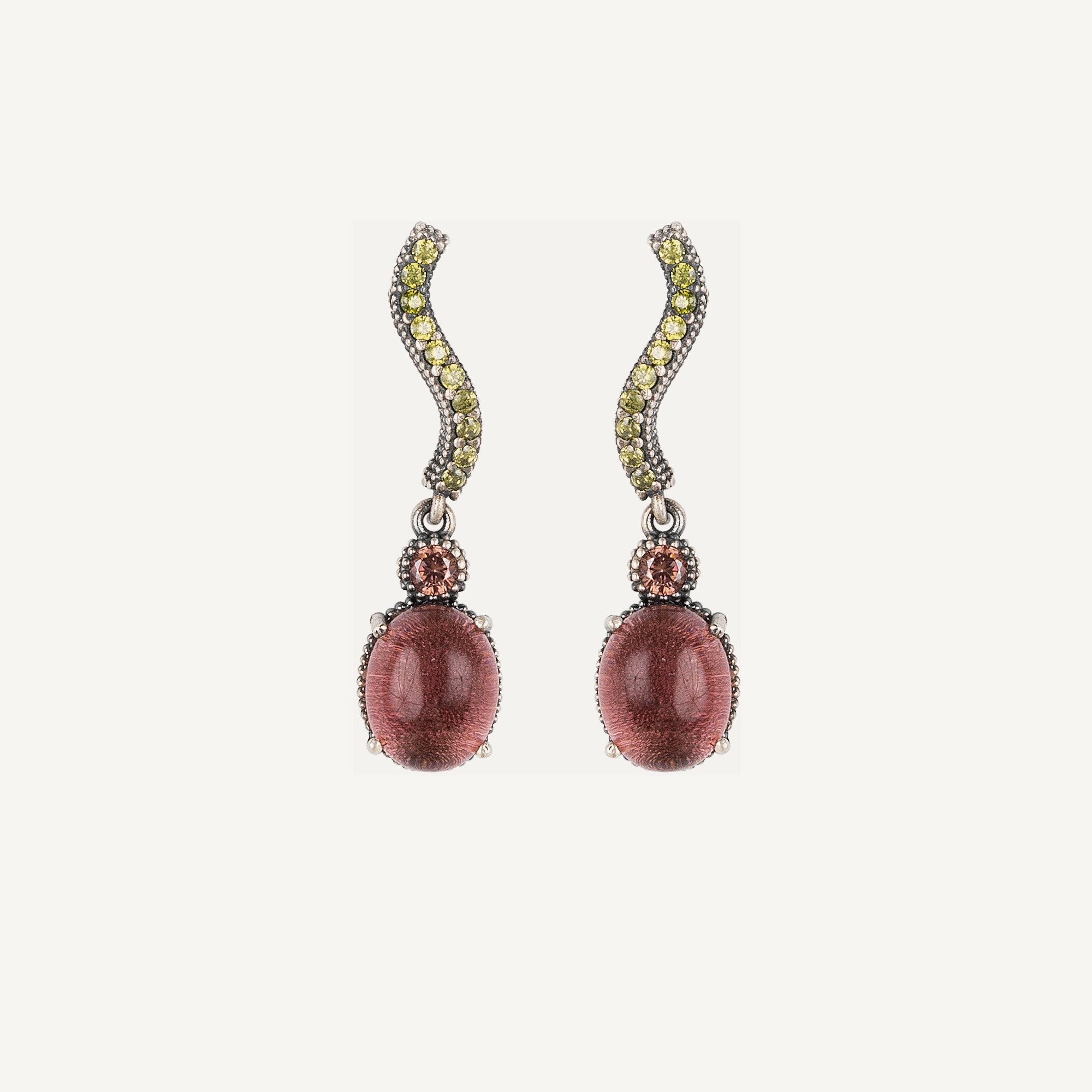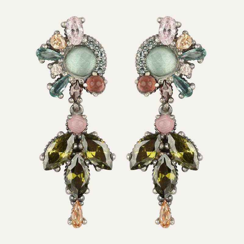 Pendientes de plata de ley 925 con acabado envejecido, turmalina, cuarzo rosa y circonitas.