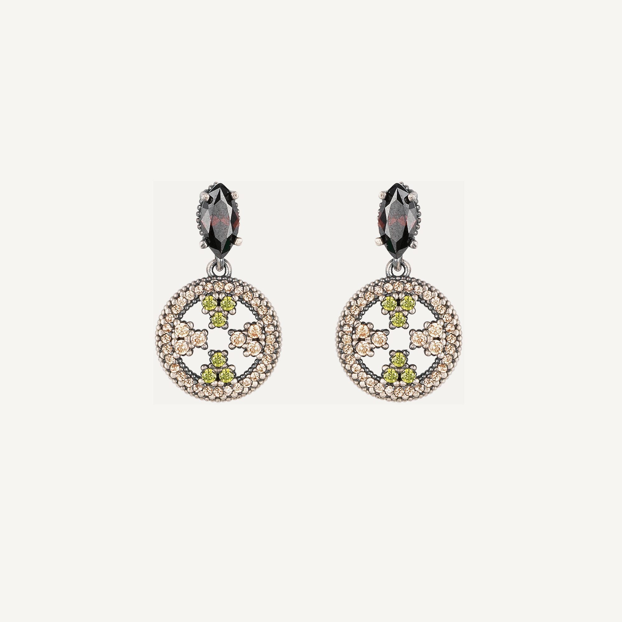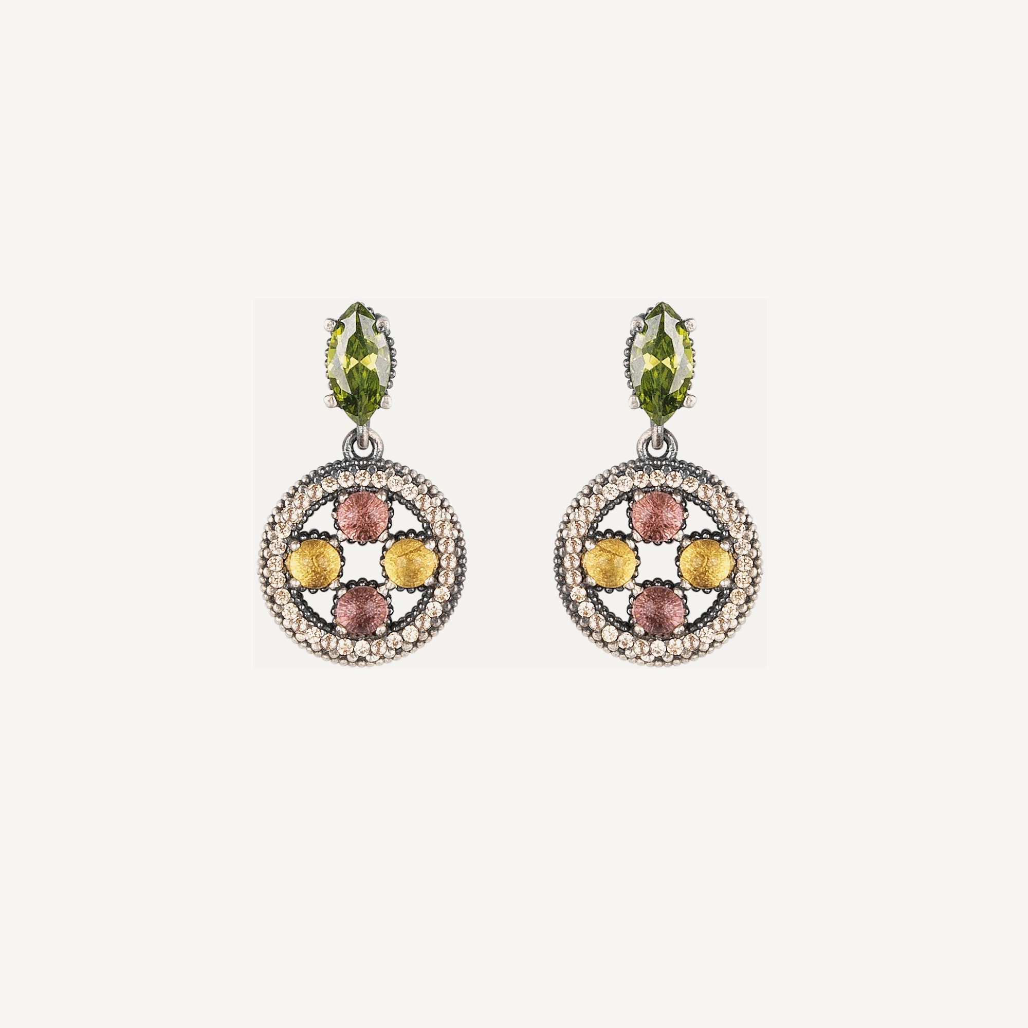 Pendientes de plata de ley 925 con acabado envejecido, cuarzo y circonitas en tres combinaciones de colores a elegir.