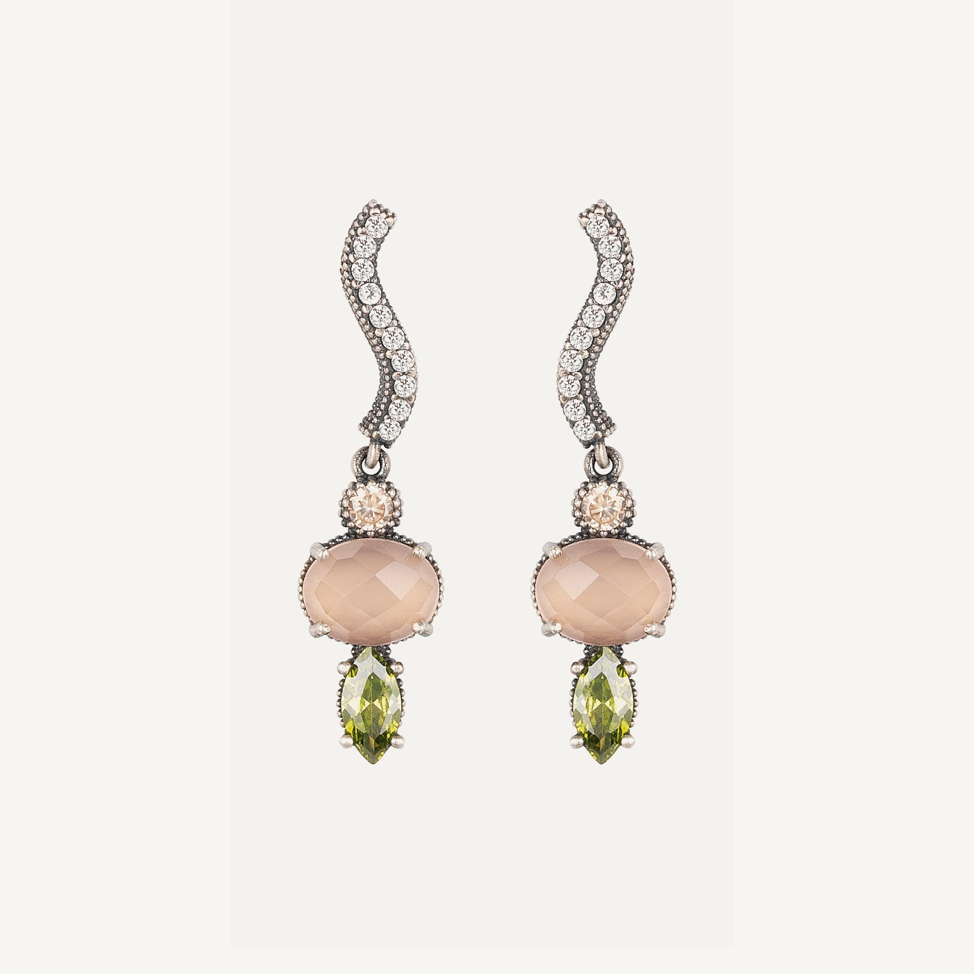 Pendientes de plata de ley 925 con acabado envejecido, cuarzo rosa y circonitas.