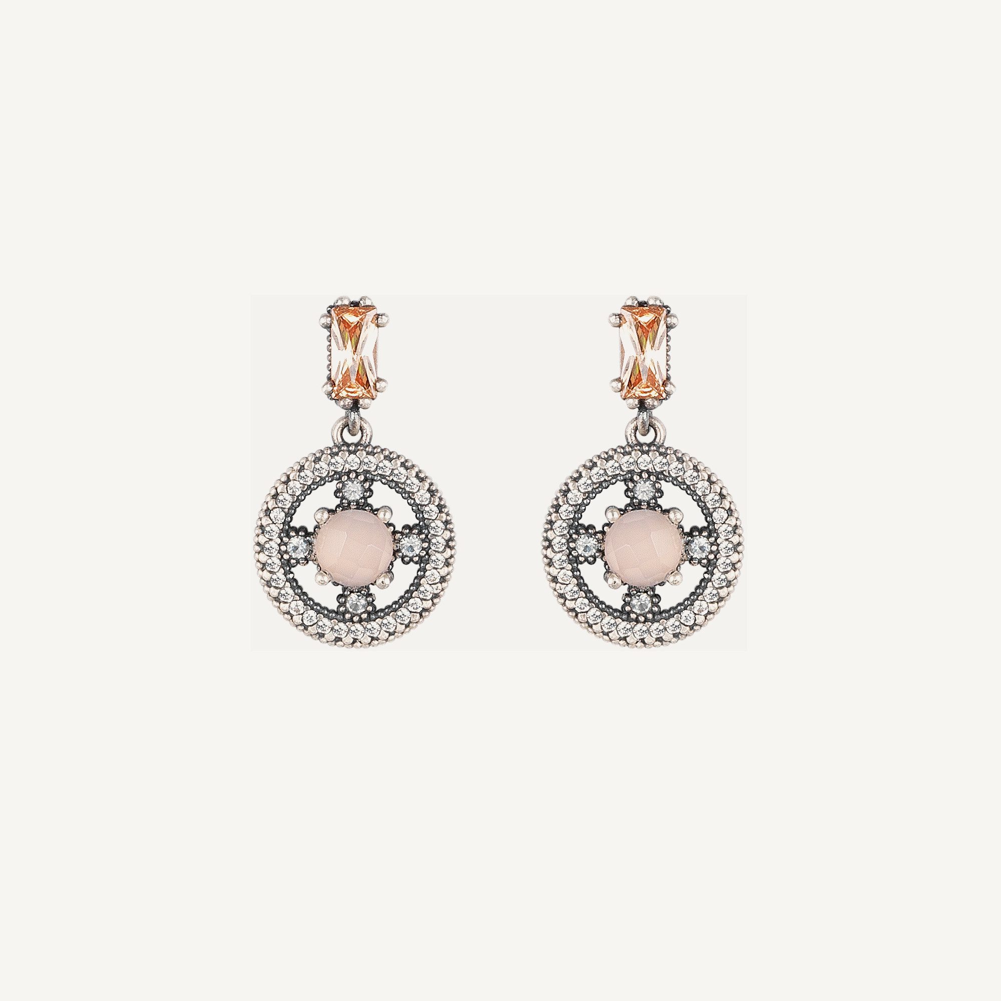 Pendientes de plata de ley 925 con acabado envejecido, cuarzo rosa y circonitas.
