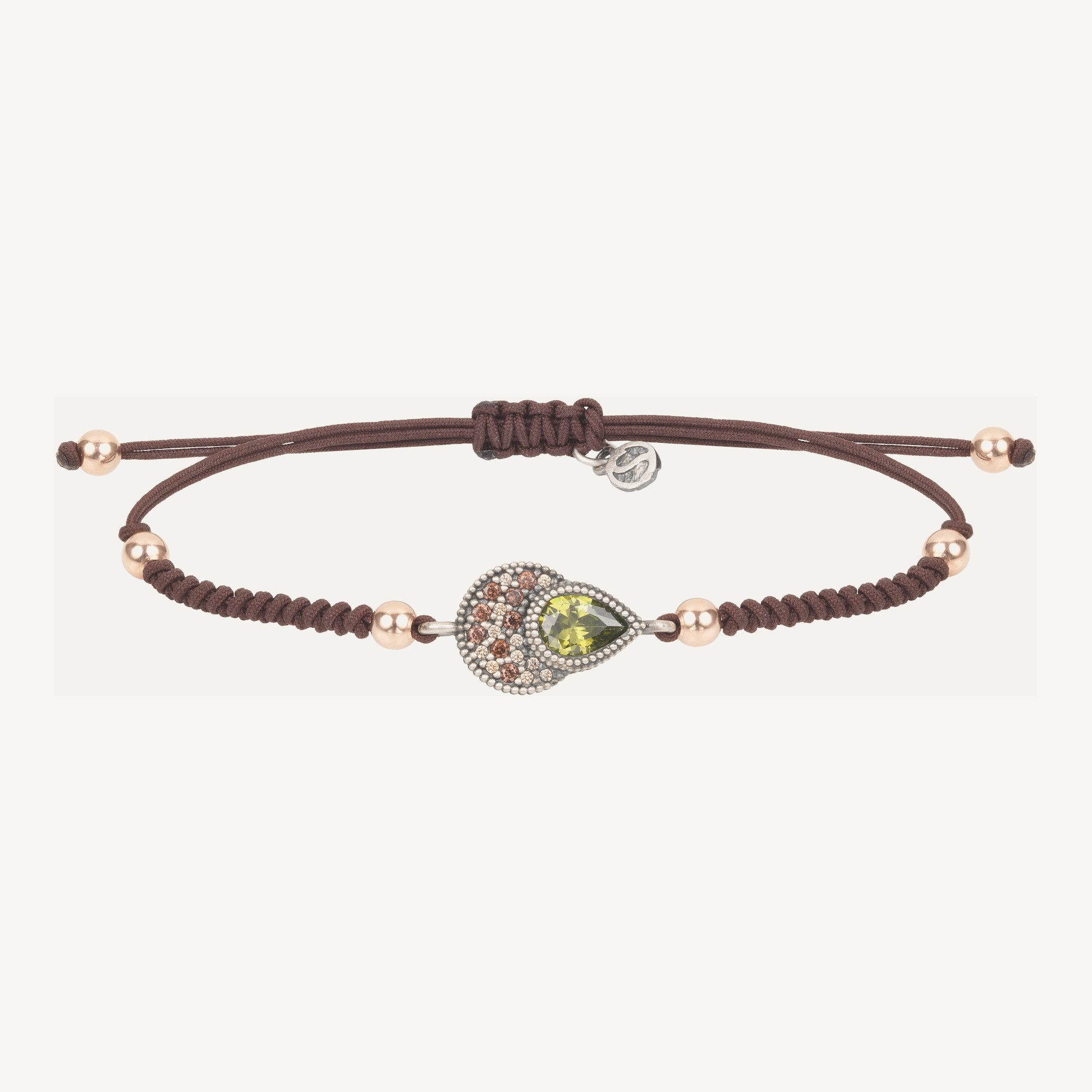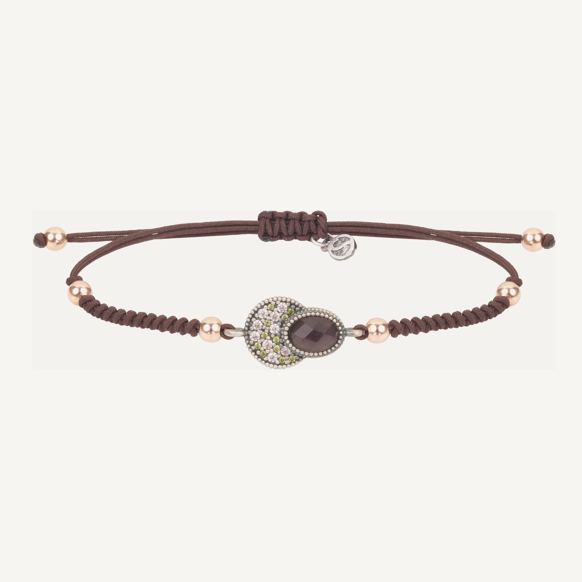 Pulsera de plata de ley 925 con acabado envejecido, cuarzo rosa, circonitas y nylon.