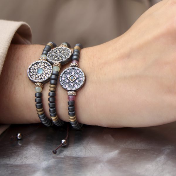 Pulsera de plata de ley 925 con calcedonia, circonitas, cuentas de cristal, hematites y nylon.
