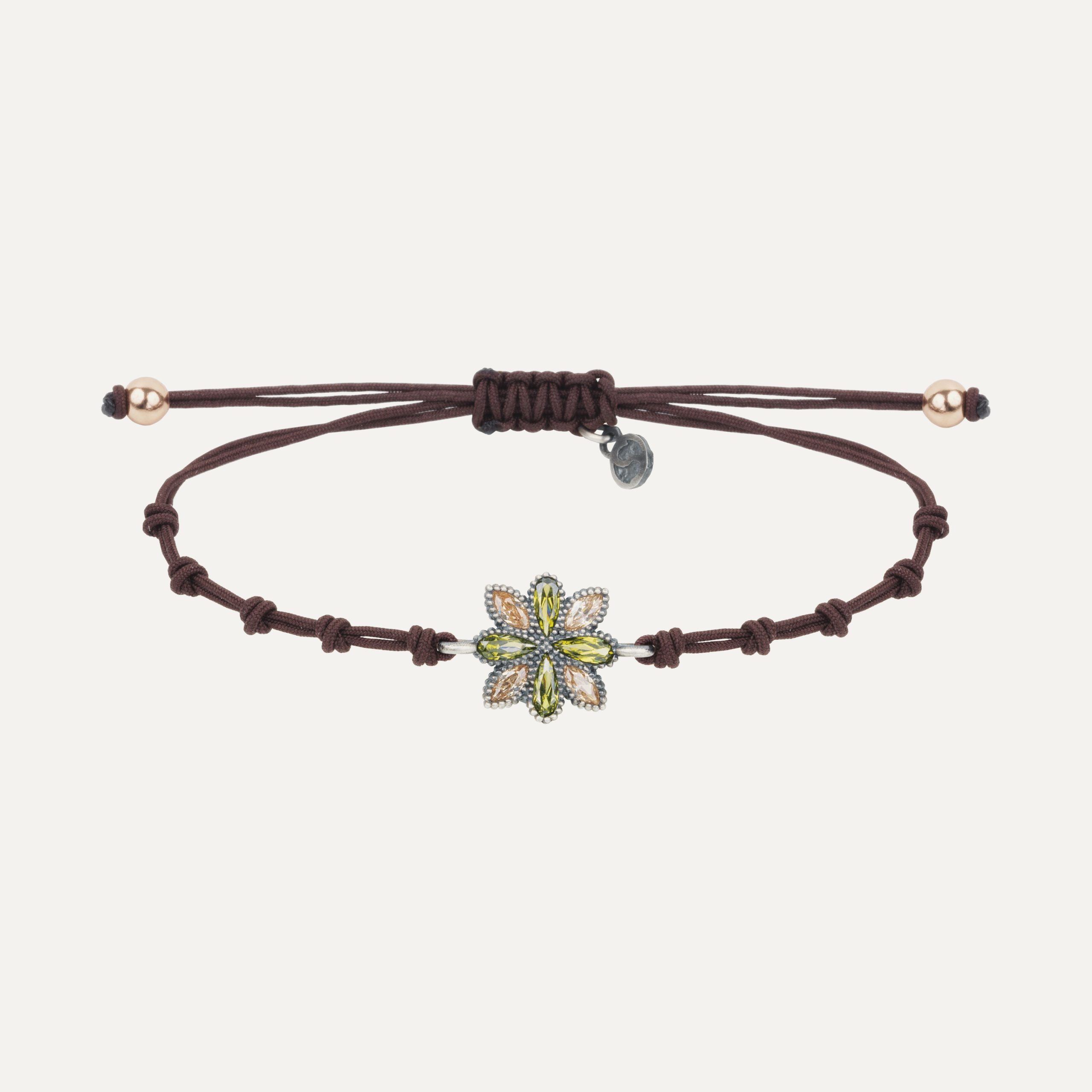 Pulsera de plata de ley 925 con oro de 9kt, calcedonia, circonitas y nylon.