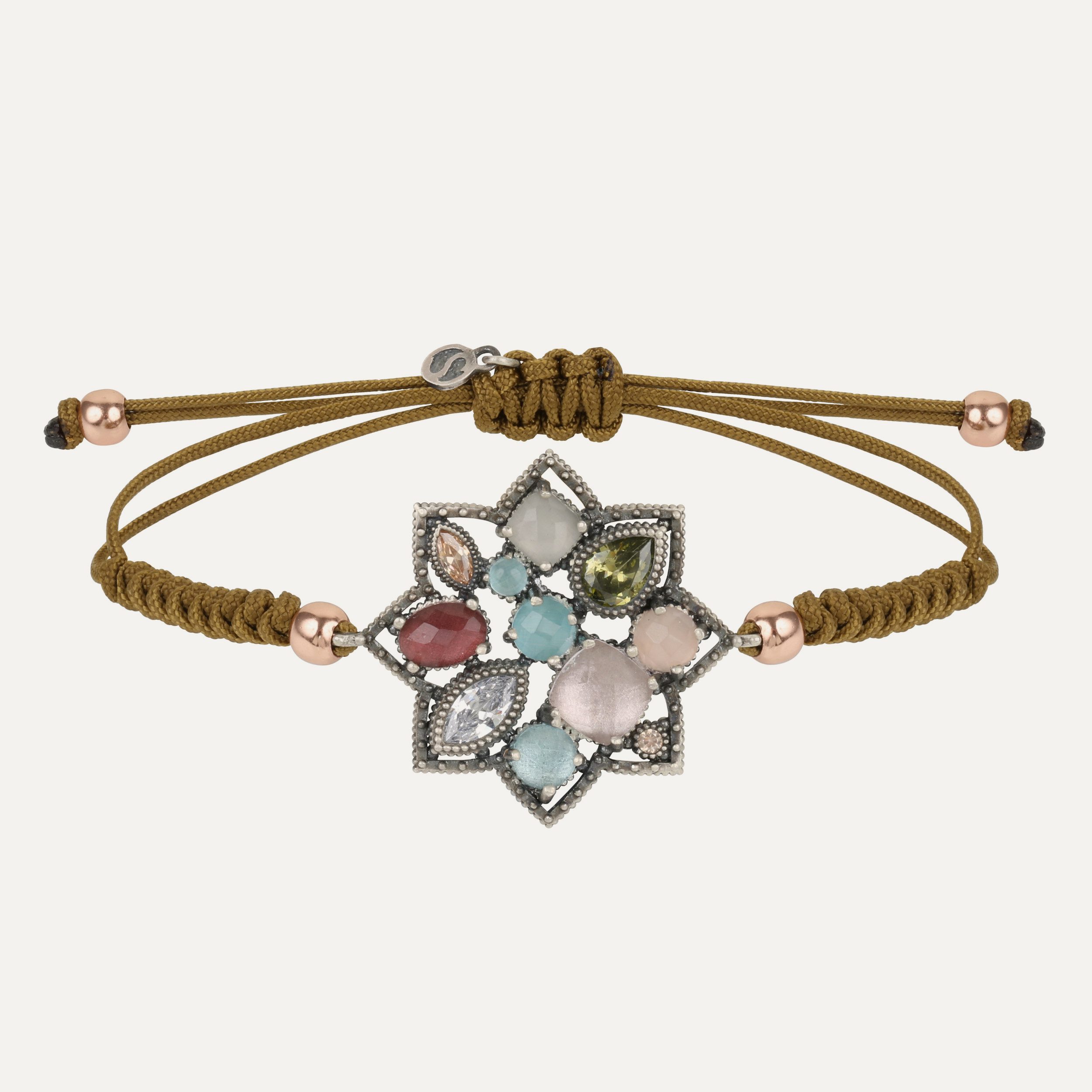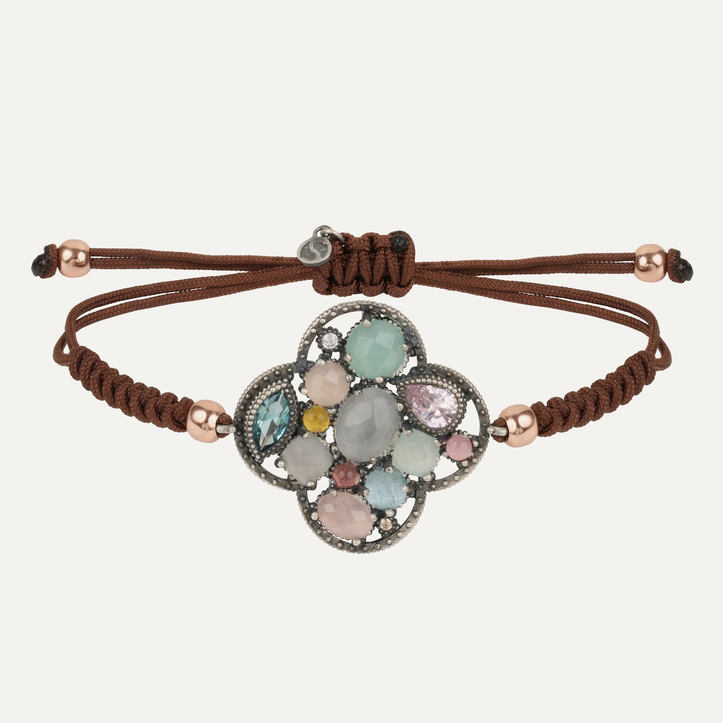 Pulsera de plata de ley 925 con baño de oro rosa de 24kt, cuarzo en diferentes colores, circonitas y nylon.