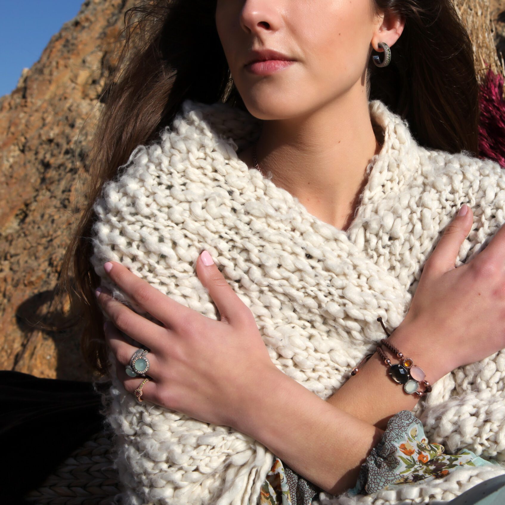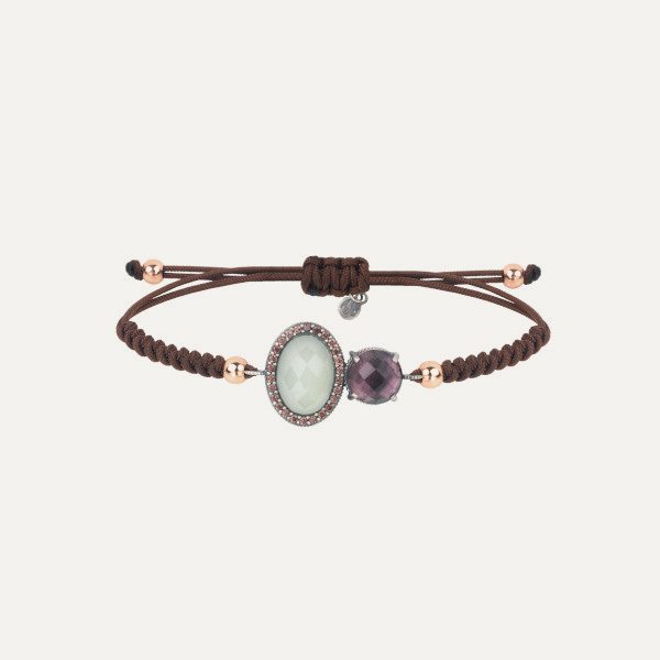 Pulsera de plata de ley 925 con acabado envejecido, calcedonia, circonitas y nylon.