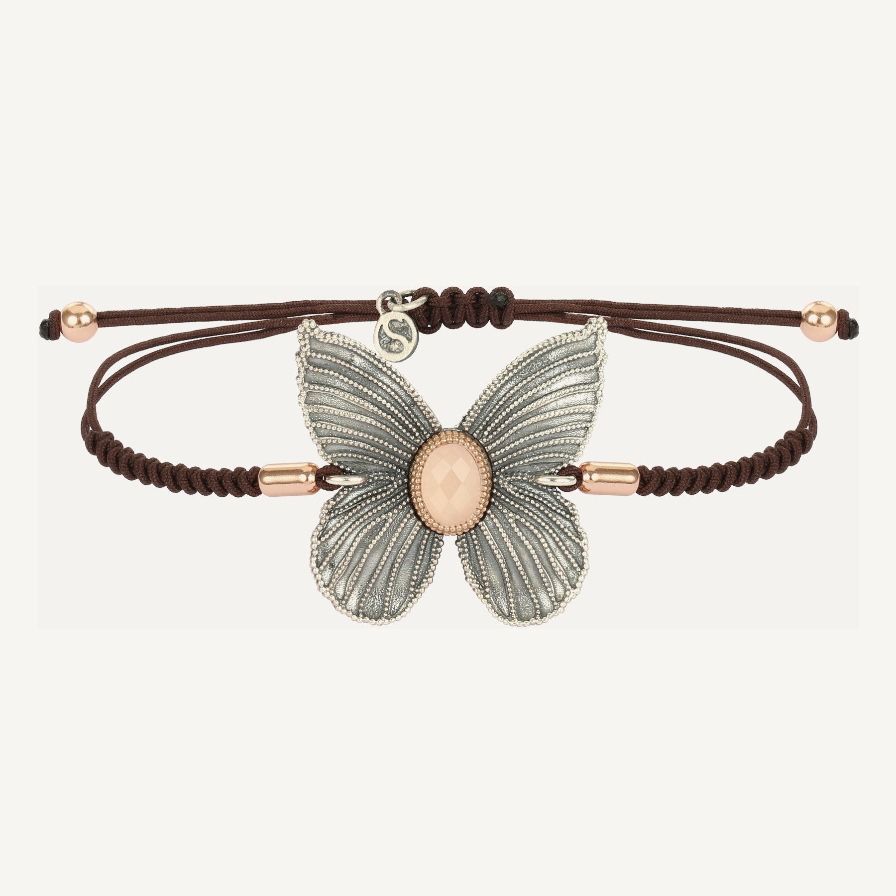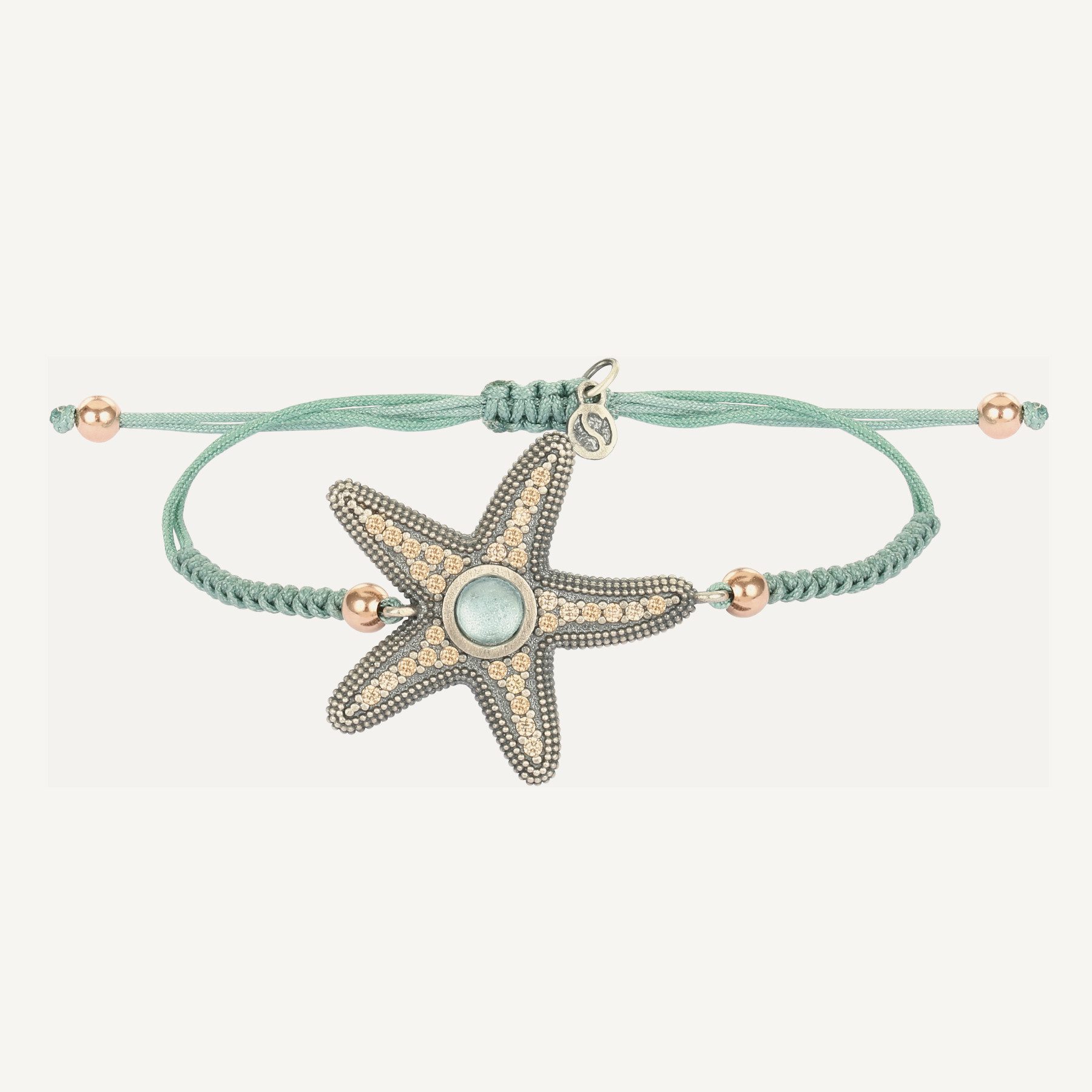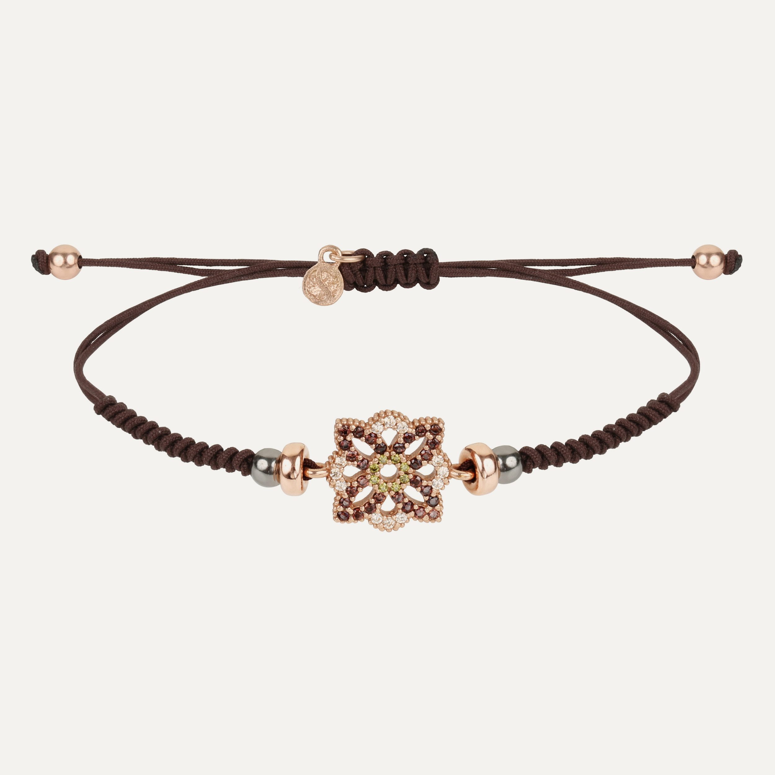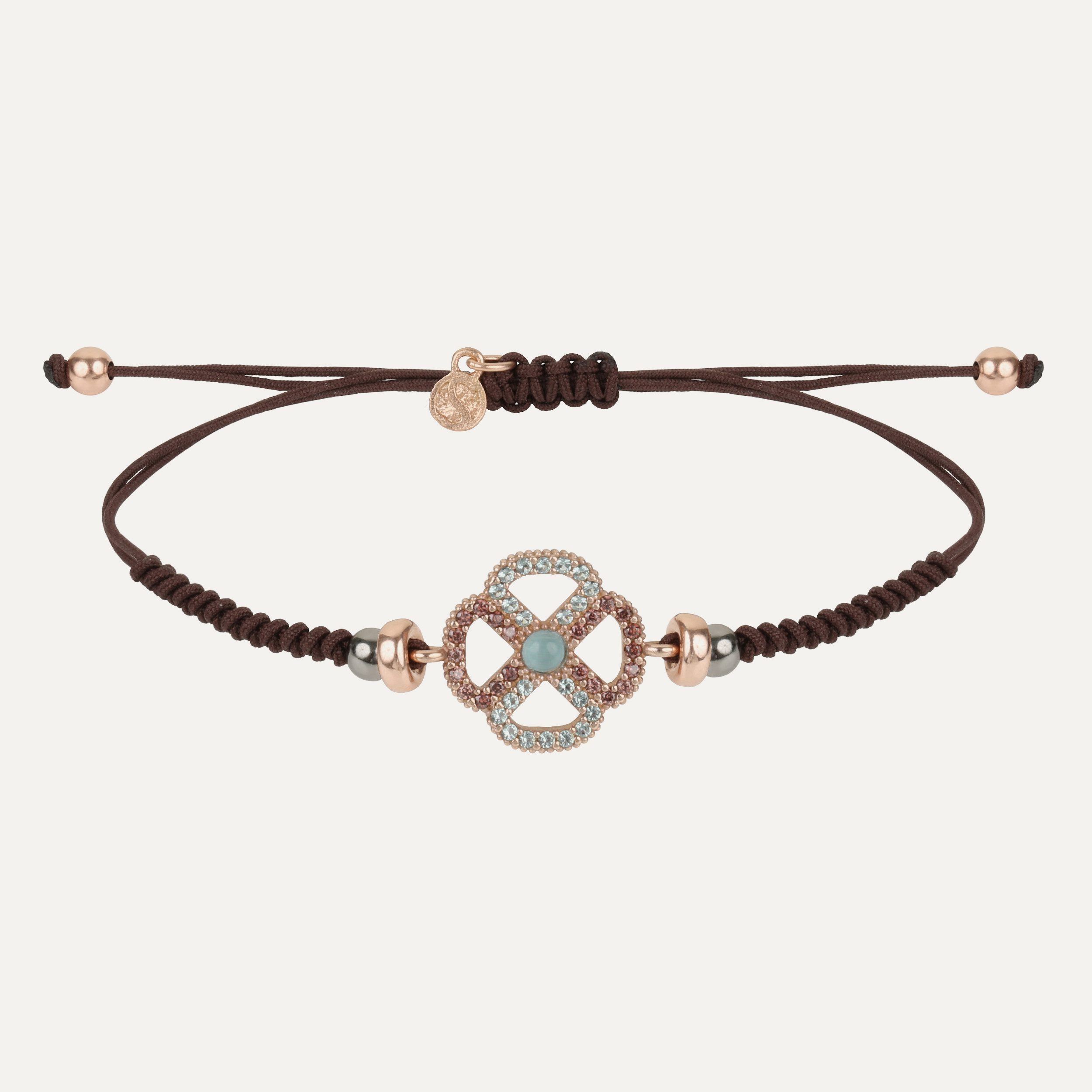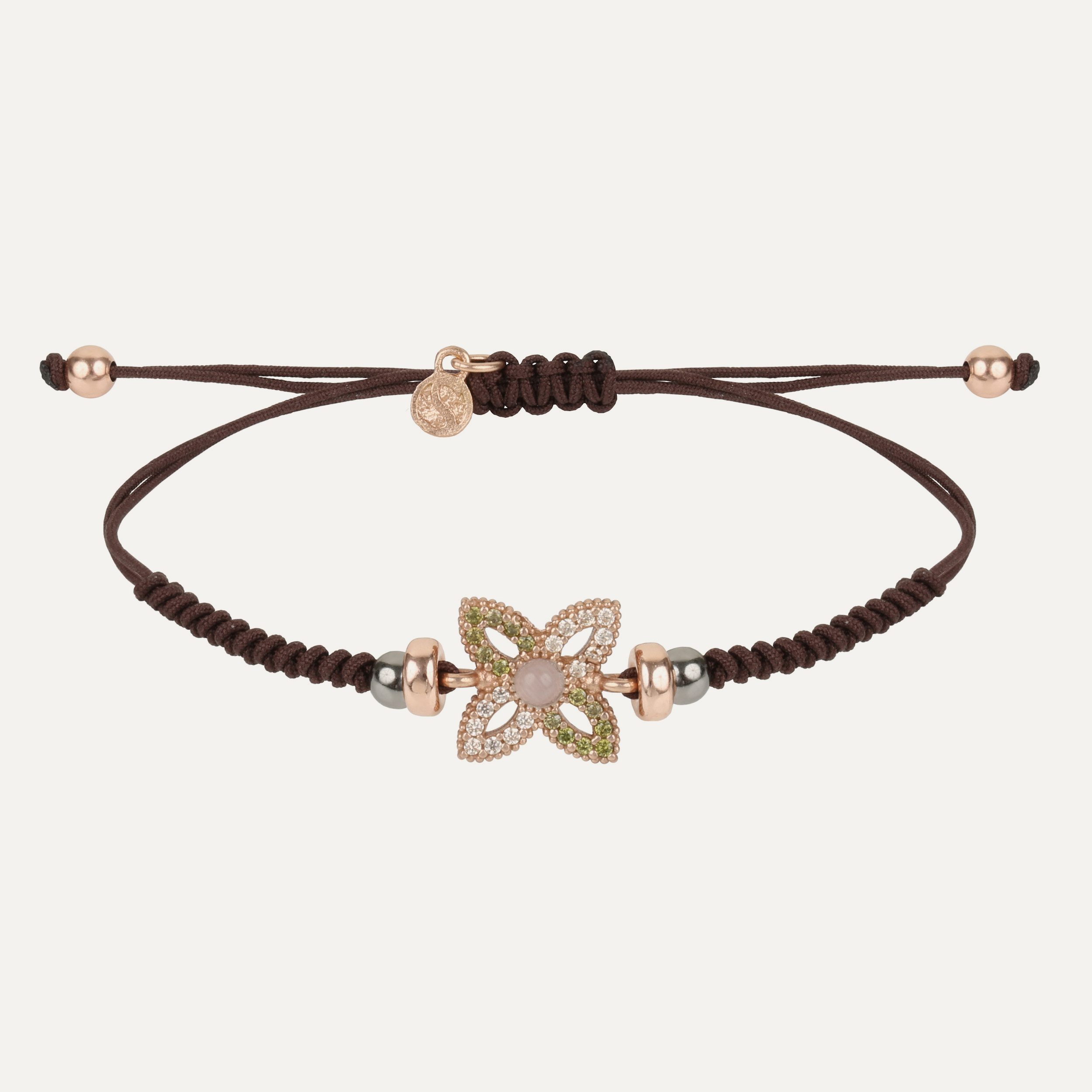Pulsera de plata de ley 925 con acabado envejecido, cuarzo rosa, circonitas y nylon.