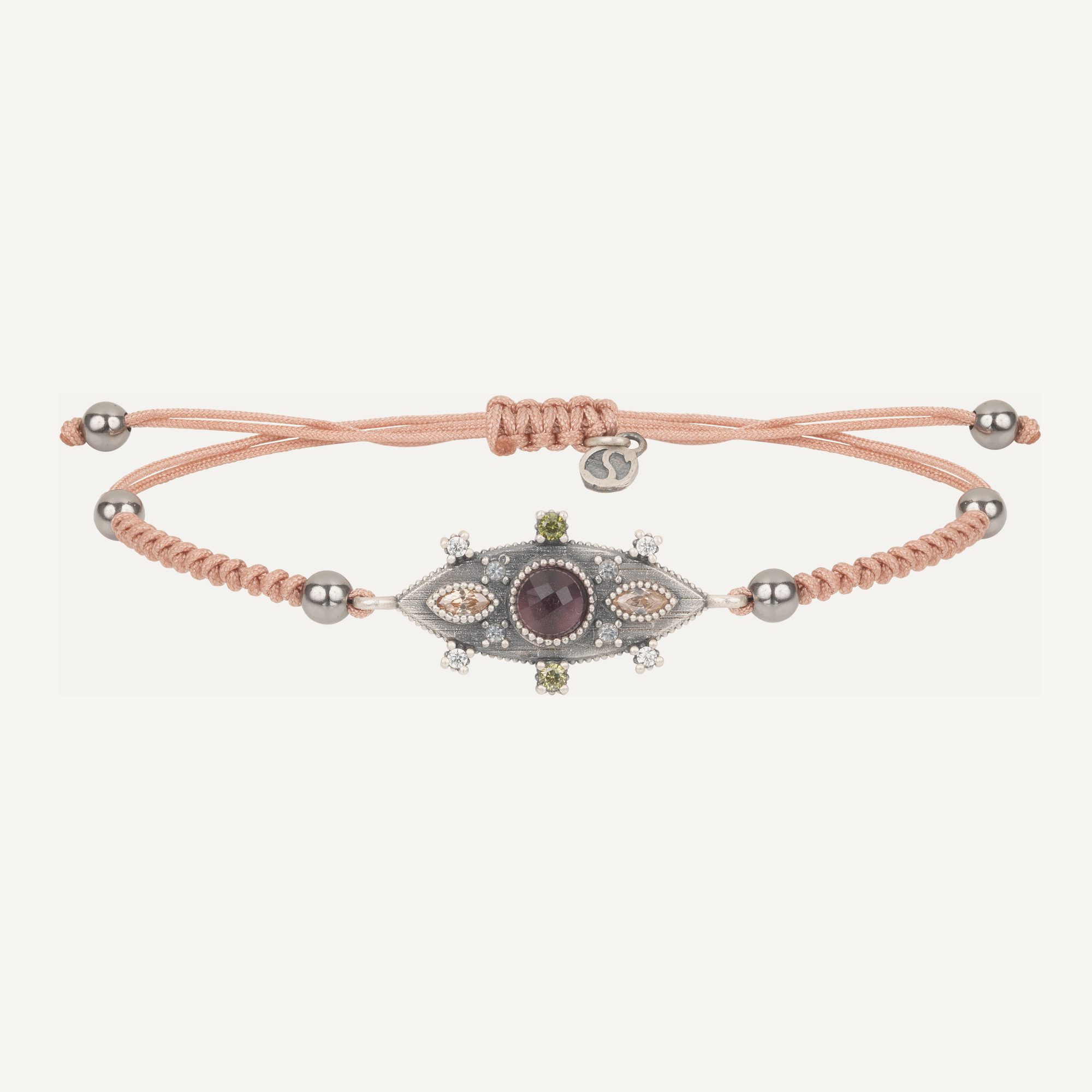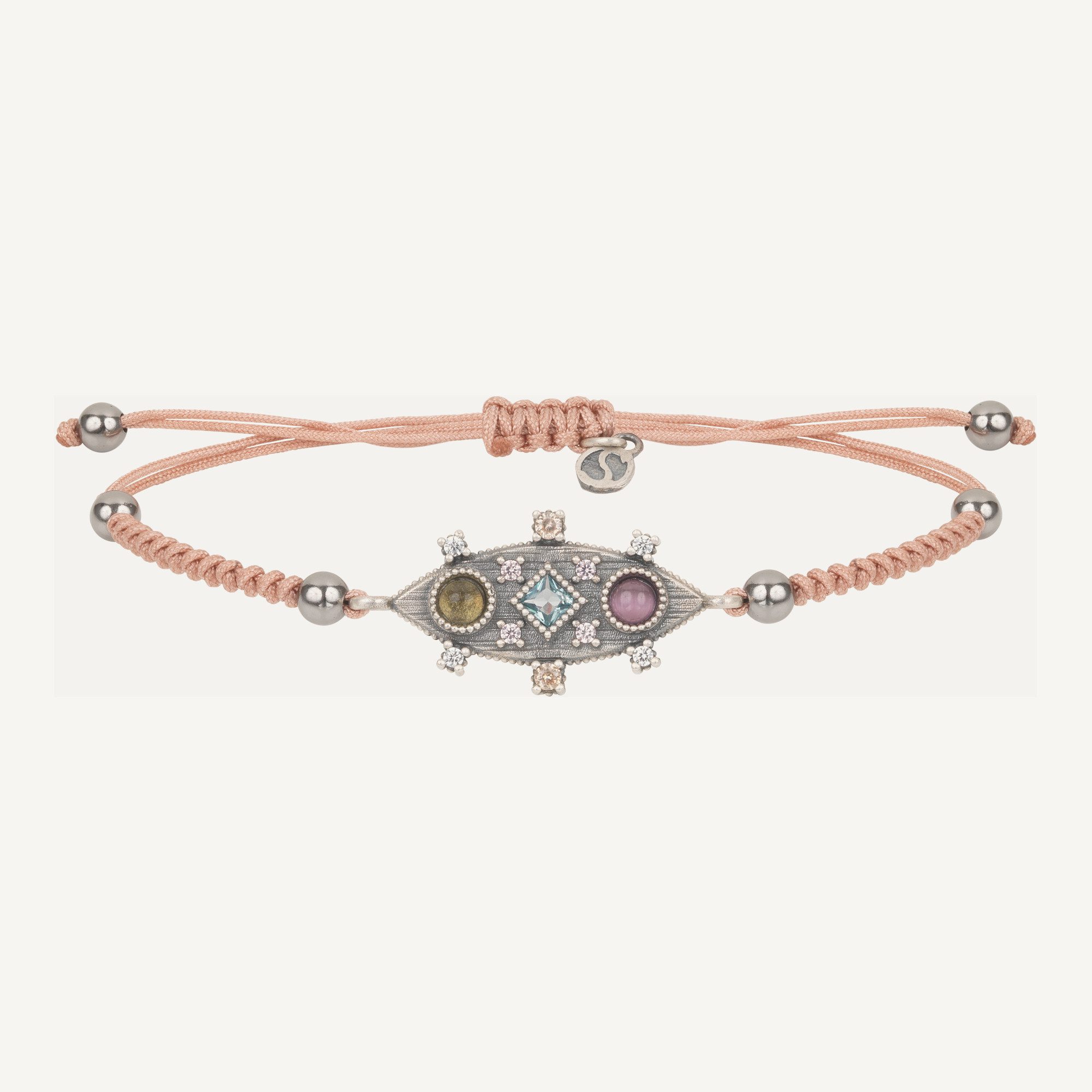 Pulsera de plata de ley 925 con acabado envejecido, turmalina rosa, circonitas y nylon.