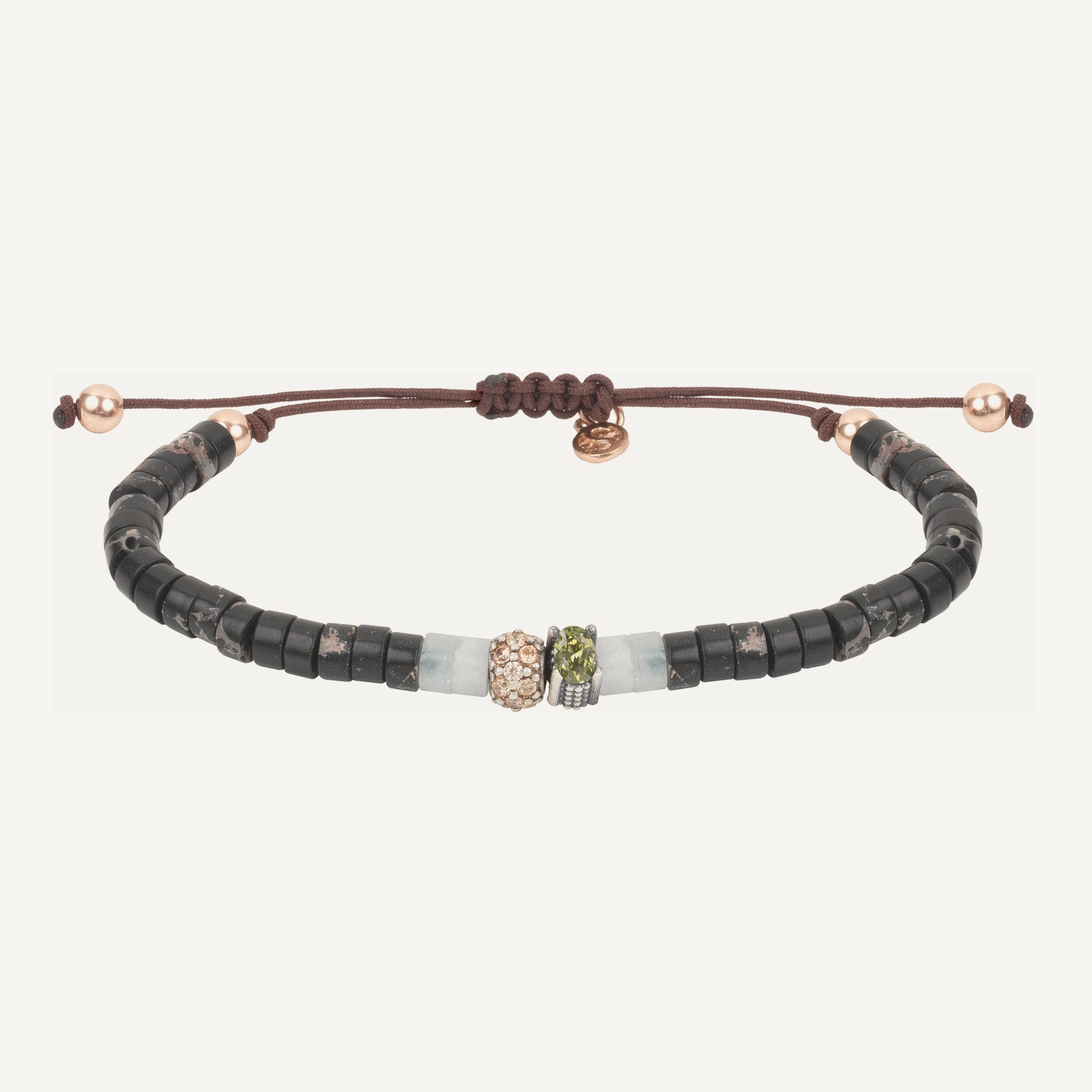 Pulsera de plata de ley 925 con baño de oro rosa de 24kt, jaspe negro, circonitas y nylon.